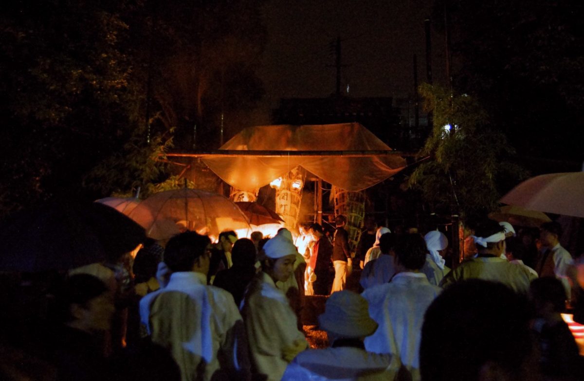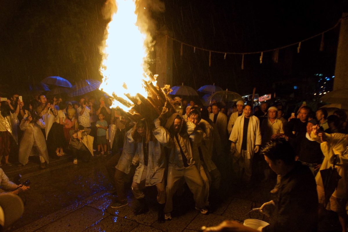 10人前後で担ぎ、交代などを含め30人以上が1体に関係しています!担ぎ手に火の粉が落ちて火傷をしないよう、バケツで水をかける人が、担ぎ手たちの頭や服に水をかけます。見学者もその火で雨が降ってるのを忘れるくらいです。