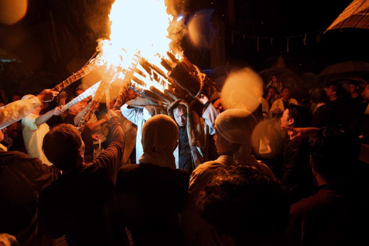 3体のお手火を取り囲む男達、担ぐ者達、見守る人達の一体感が段々出てきました。もう拝殿はすぐそこです。昔も今も火は恐れられるからこそ、火を神聖視して、火の神として畏敬する火祭りは、厄払いを願う祭りです。