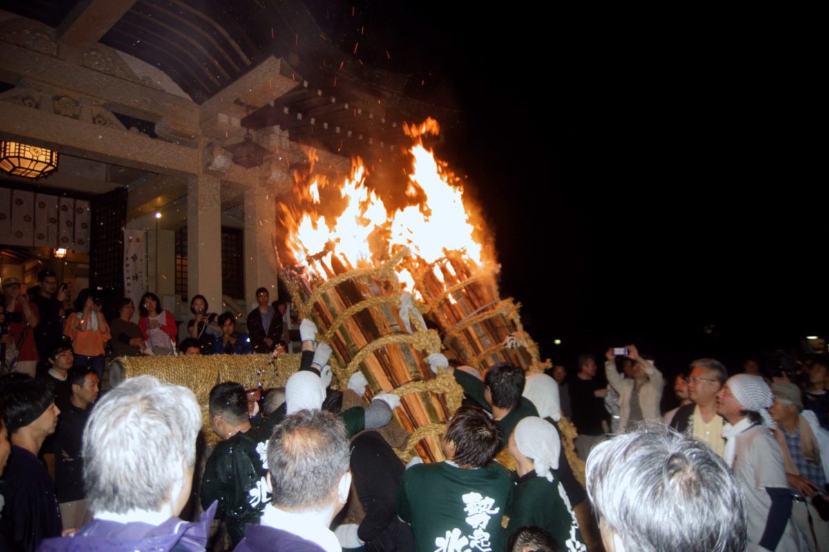 この後は、お手火を自分たちの町内に持ち帰り、翌日の神社渡御に備えて町内をお清めするようです。燃え続けるお手火は台車に載せ、自分たちの町内に帰る道筋と町内の隅から隅までを引いて回り、町内を清めたら終わりです。お手火の火を消すころには日付が変わり、翌朝は早朝から氏子地区の役員たちは神社に集まり、境内に落ちた松明の燃えカスなどをきれいに掃除します。初めの沼名前神社の写真は早朝の写真です。