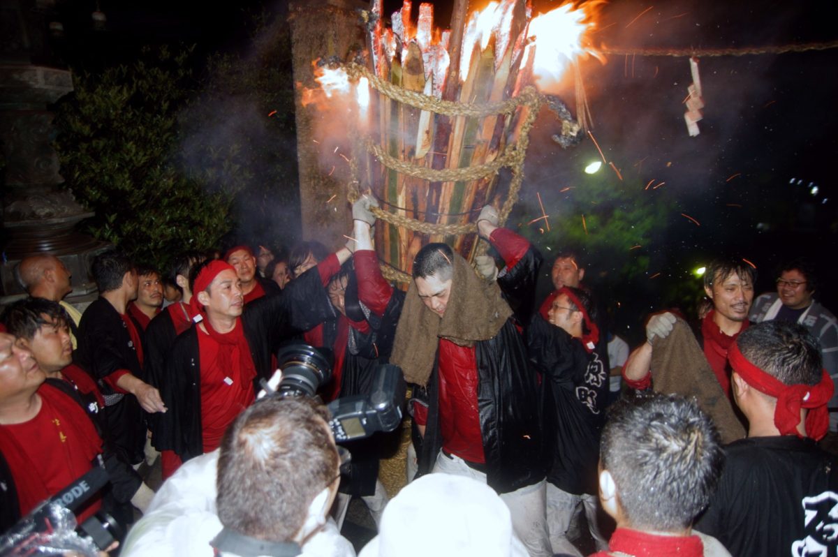 各自水をかぶり、炎へ向かっていきます。そして担ぐ!9つある町内の方達が、先の体、中の体、後の体に分かれ、それぞれの3体の中で当番町を毎年回り順番で担ぐようです。20~30分間隔で大手火に点火され、各自水をかぶり掛け声をかけあって気合を入れ、お手火を担ぎ上げ、随神門をくぐって拝殿を目指します。