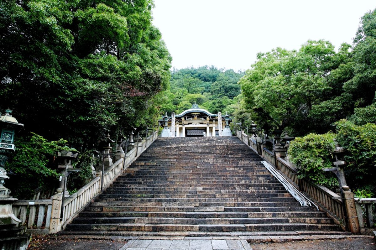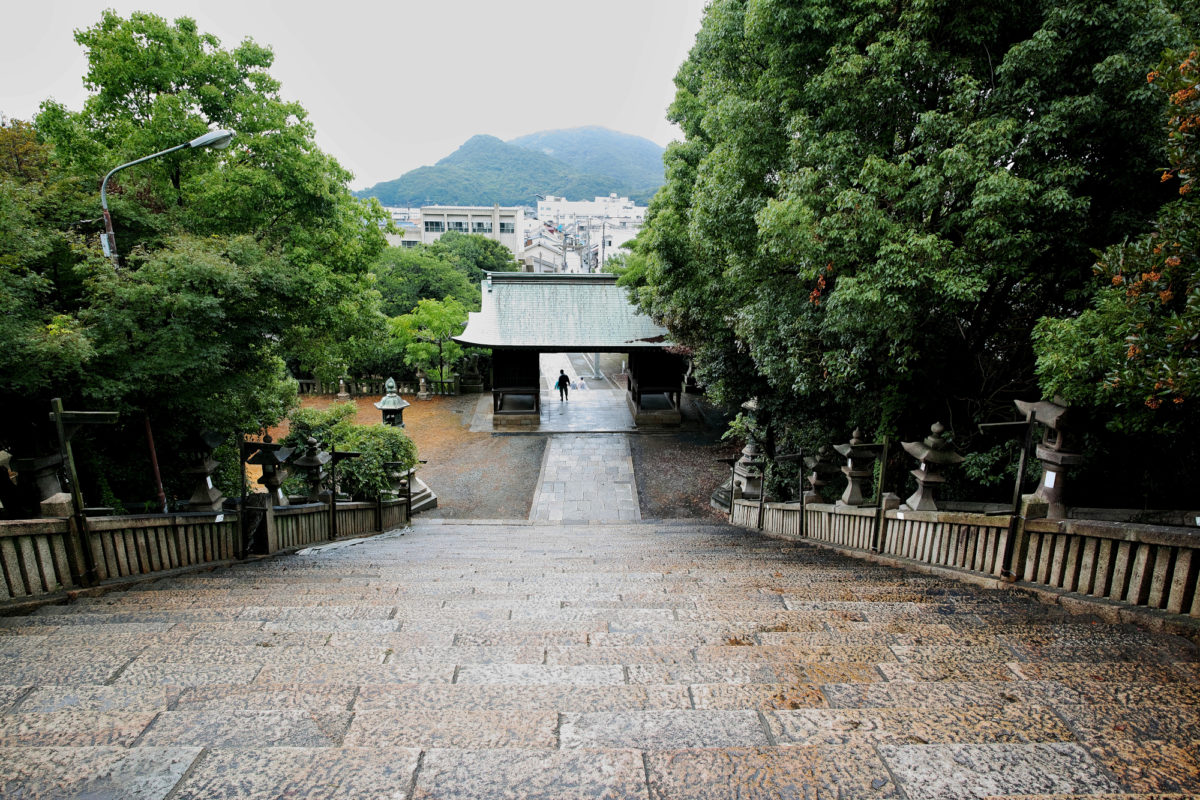広島県福山市鞆町後地「沼名前神社」で、7月第2日曜日の前夜20時から、重さ約200キロ、長さ約4メートルの大松明三体を大石段を練り上がる勇壮な火祭りで、日本三大火祭りのひとつ「お手火神事」(おてびしんじ)です。写真がその石段です。