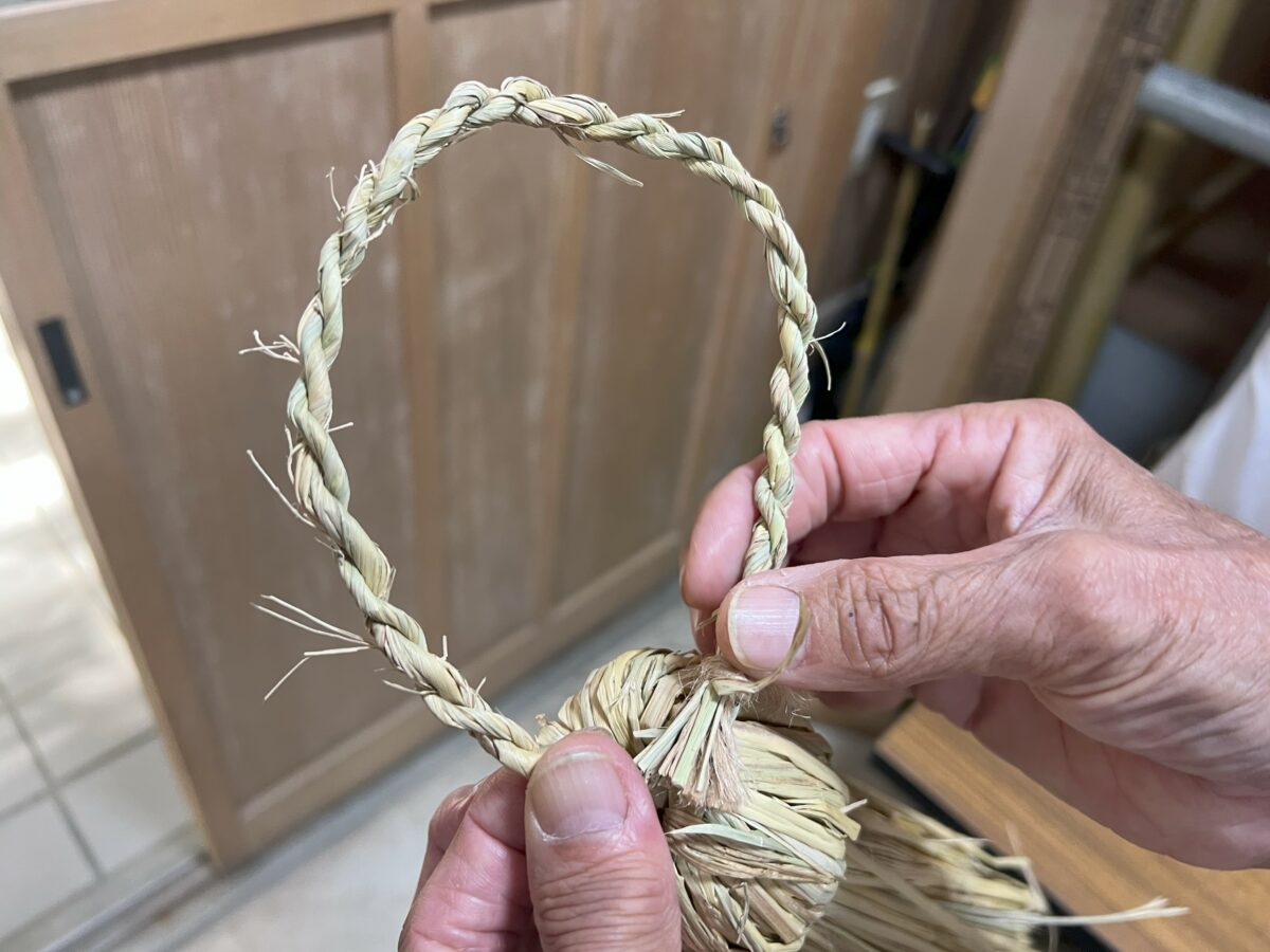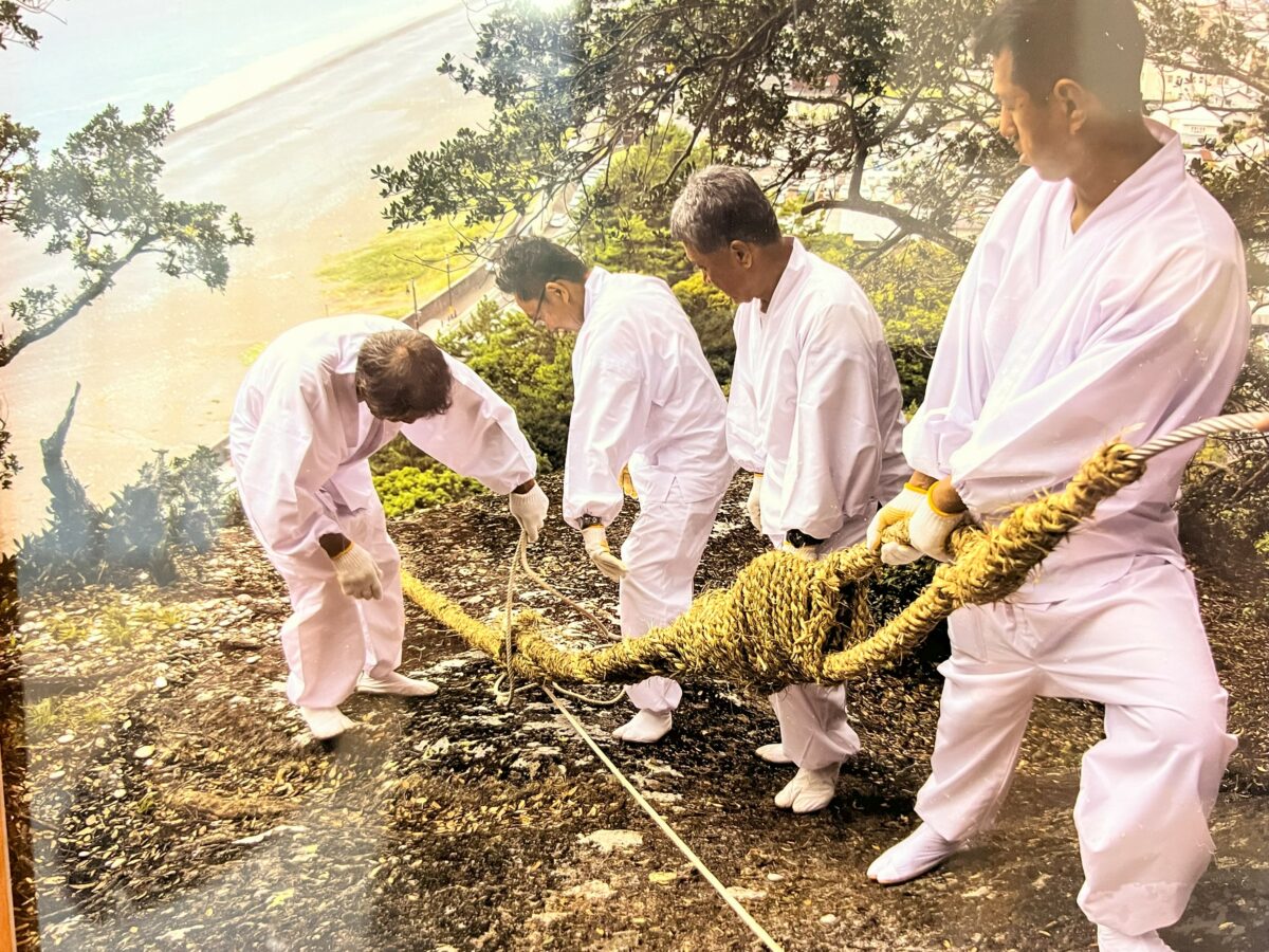 神事に使われるこの大綱は、イザナミが産んだ7つの自然神(風、海、木、草、火、土、水)を表す7本の綱を編んで束ねたもの。綱は地元で収穫されたもち米のわらが使われており、地域住民らの手によって作られます。
