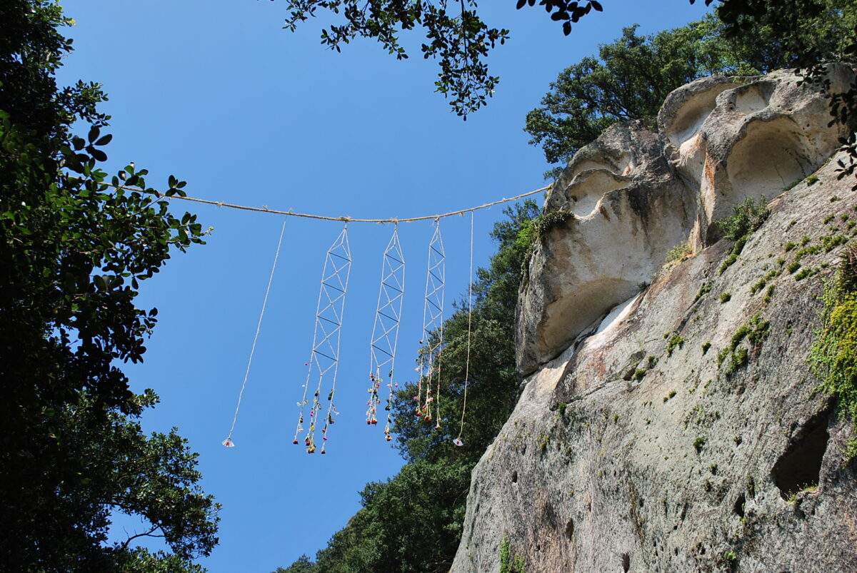 この花の窟神社では、毎年2回、春(2月2日)と秋(10月2日)に例大祭が開かれます。高さ45メートルもの巨大な磐座(いわくら)の上から、約170メートルの大綱を支柱にかける「お綱かけ神事」は、そのスケールの大きさに見る者を圧倒するのだとか。また、この神事、地域の人のみならず参拝者も参加できる点も大きな魅力。
