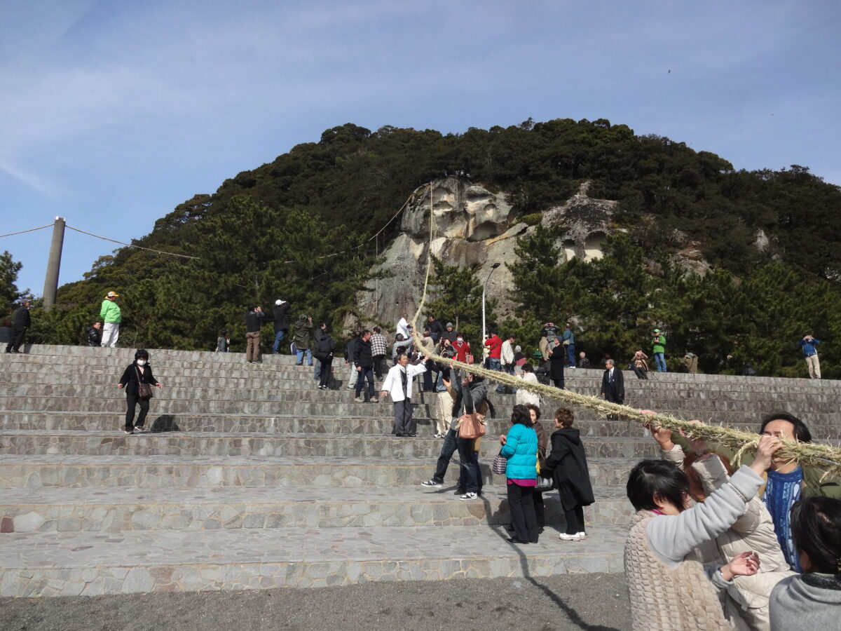 もう一方の端は、地域の方や観光客が力を合わせて、七里御浜(しりちみはま)の波打ち際までいったん引いてのばしたのち、境内の柱にくくりつけられます。古くより、この大綱に触れると、イザナミノミコトの魂と繋がり、願いが叶うといわれていることから、このご利益にあずかろうと、毎回、全国から大勢の方がこの神事に参加します。一般的に地域に根付いたお祭りは、観光客の参加が難しいイメージが強いですが、地域の方と一体となって参加できるのはうれしいですね。