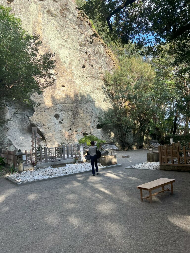 「花の窟神社」には、通常の神社と違って社殿がありません。なんとご神体は、熊野灘に面した高さ約45メートルのこの巨大な磐座(いわくら)。この厳粛な雰囲気と、壮厳な佇まいに、おのずと姿勢を正してしまいそうです。