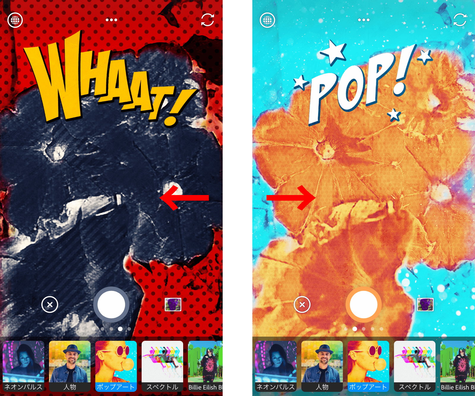 好きなレンズを適用して,画面をスワイプすると幾つかのバリエーションも試せます。