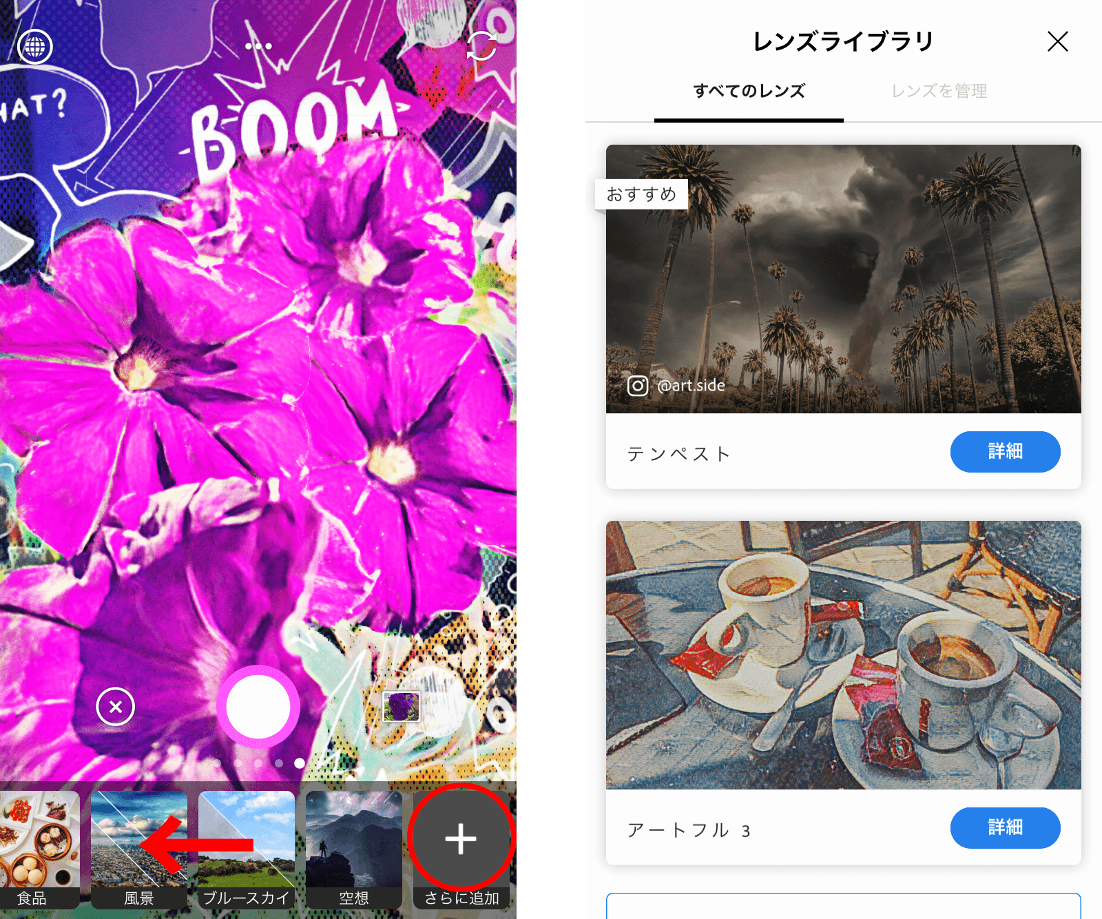 レンズメニューをいちばん右までスワイプすると,新しいレンズを追加できます。