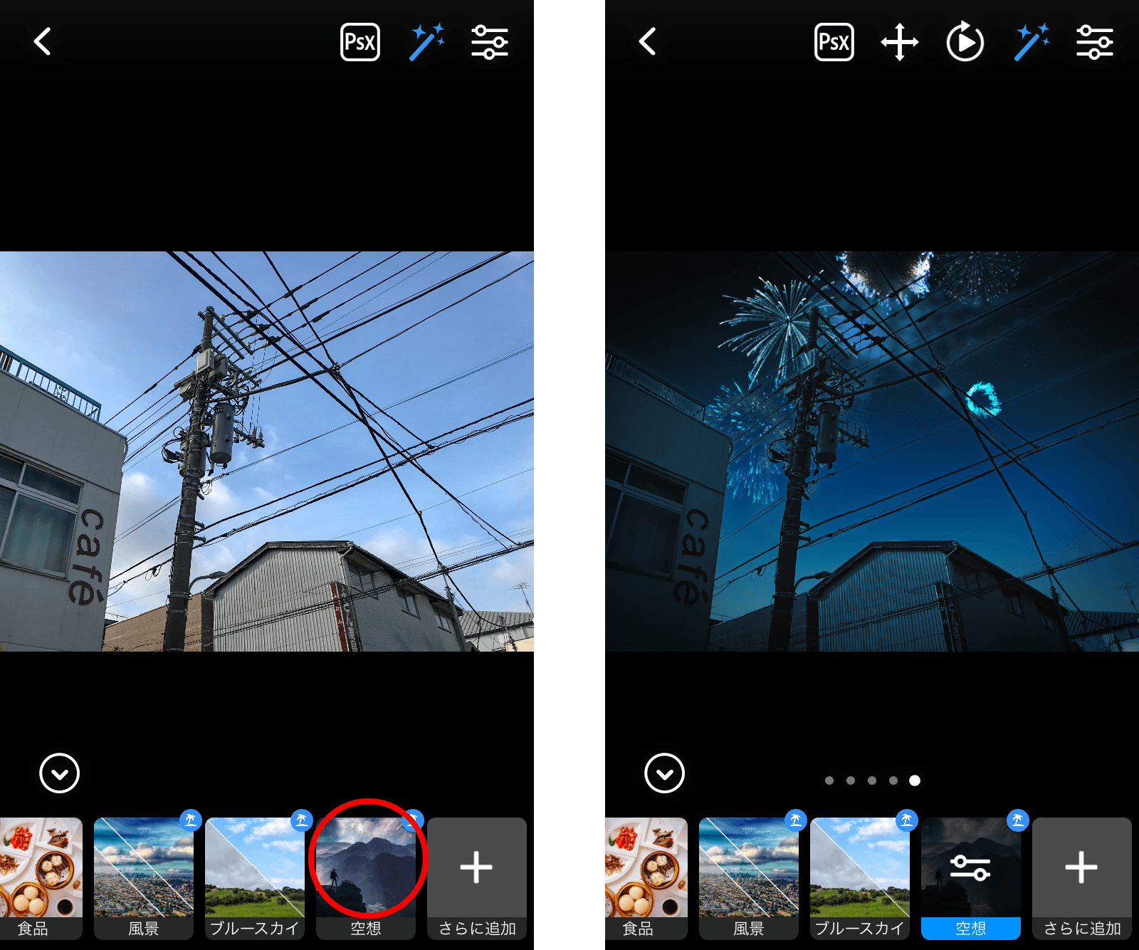 とは言っても,個人で花火を打ち上げるのも難しいですよね。でも,「Photoshop Camera」があれば大丈夫。「空想」レンズを選ぶと空の部分が「流れ星」や「気球」に置き換わります。画面をスワイプしていくと…