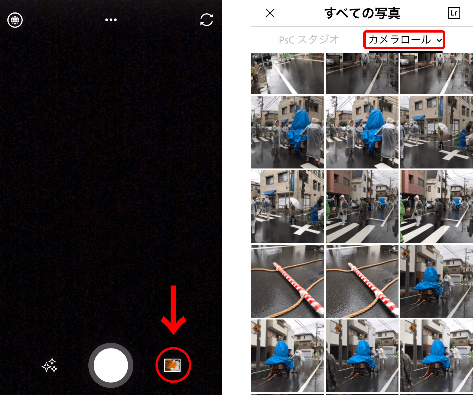赤丸で囲ったアイコンをタップすると,既に撮影した写真を使うことも…