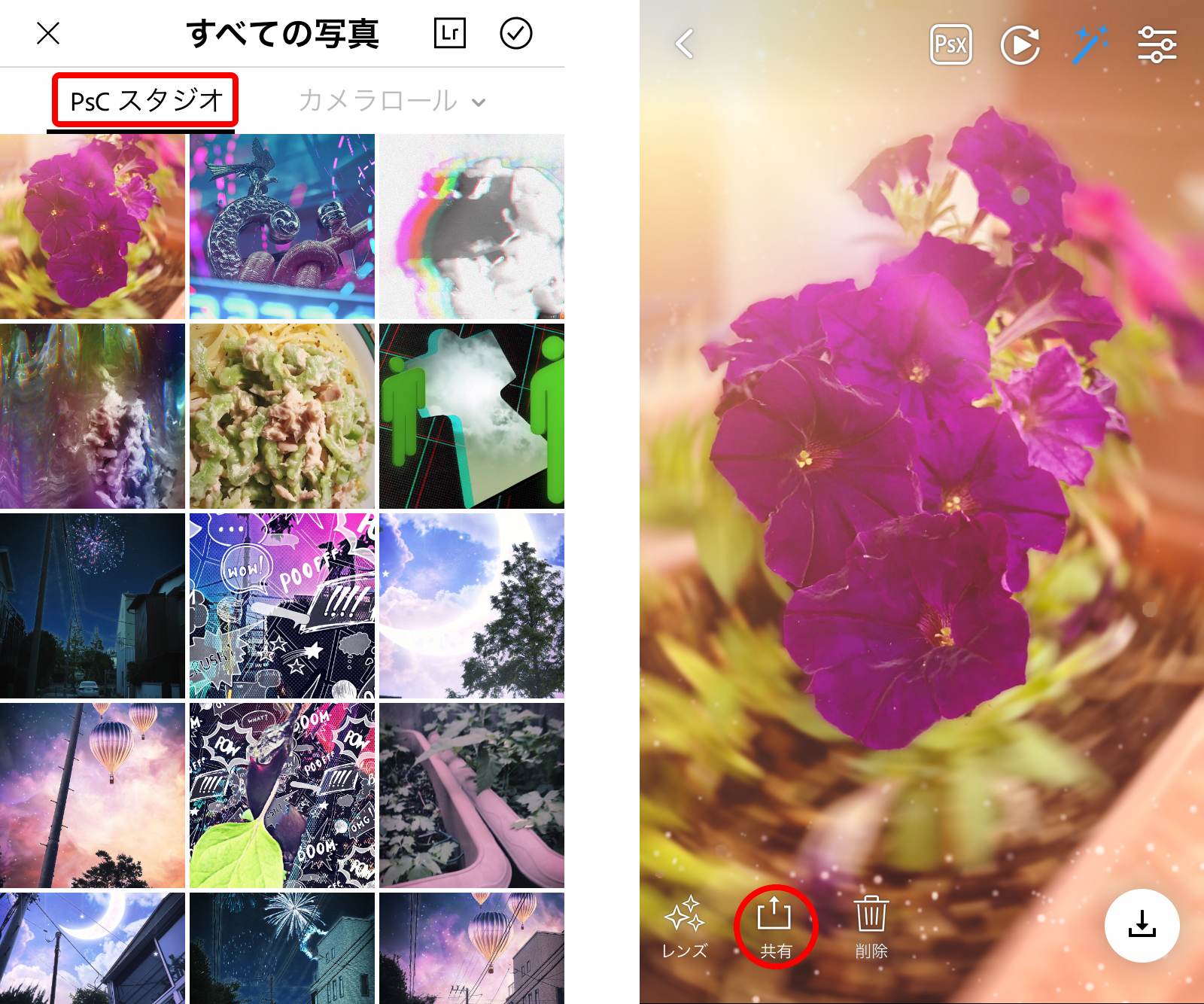 「Photoshop Camera」で撮影したり変種した写真はPsC スタジオに保存されます。ここから写真を選んで,再編集したり,FacebookやInstagramなどで共有することもできます。