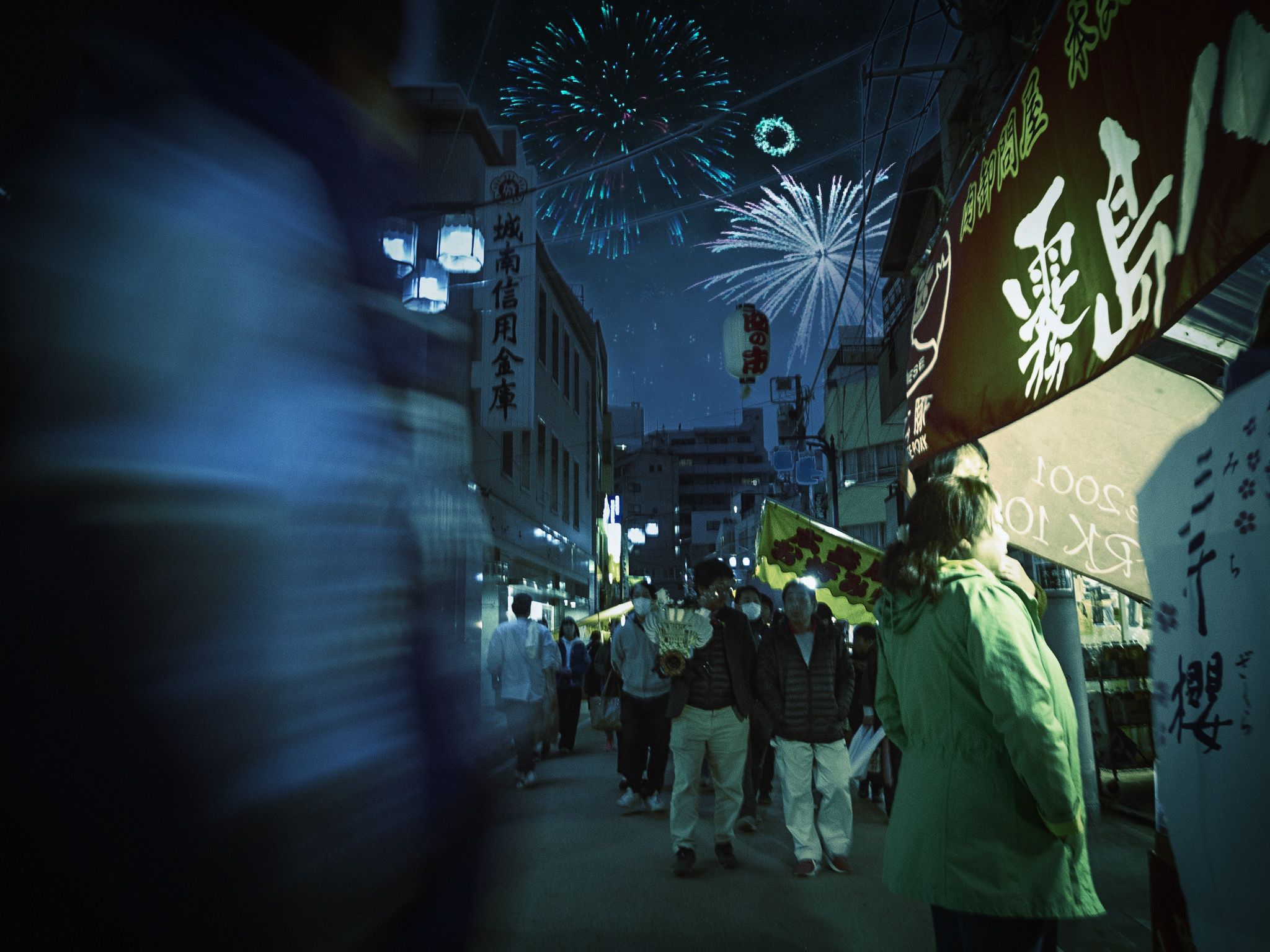 大森鷲神社。酉の市で花火?「合成写真だよ」って言わないと気が付かないかも。