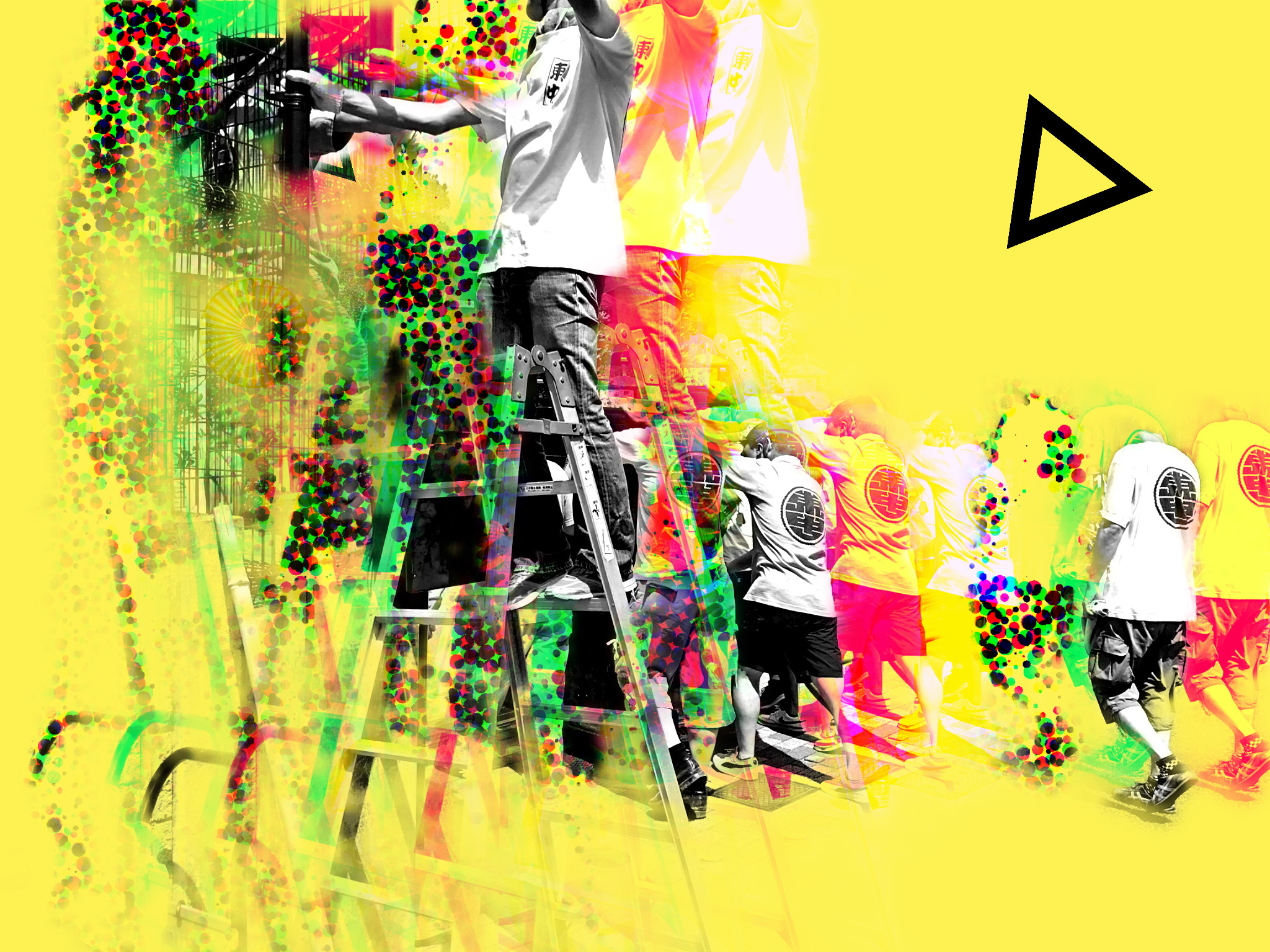お祭りの準備中の写真に「スペクトル」レンズをかけてみました。楽しそうですね。「お祭りスタッフ募集」のポスターに使えそうです。