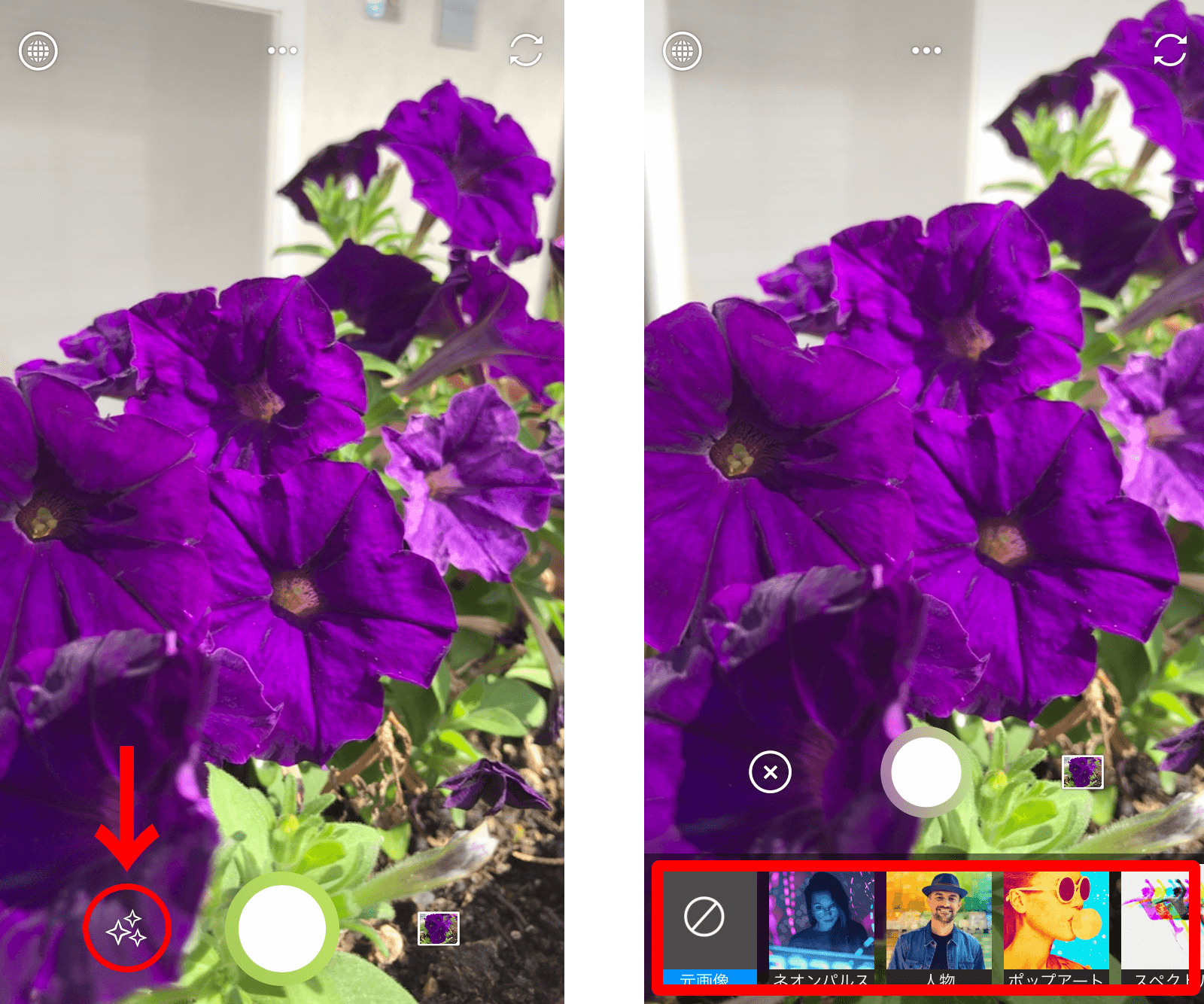 左下のキラキラしたアイコンをタップすると,いろいろなレンズが表示されます。