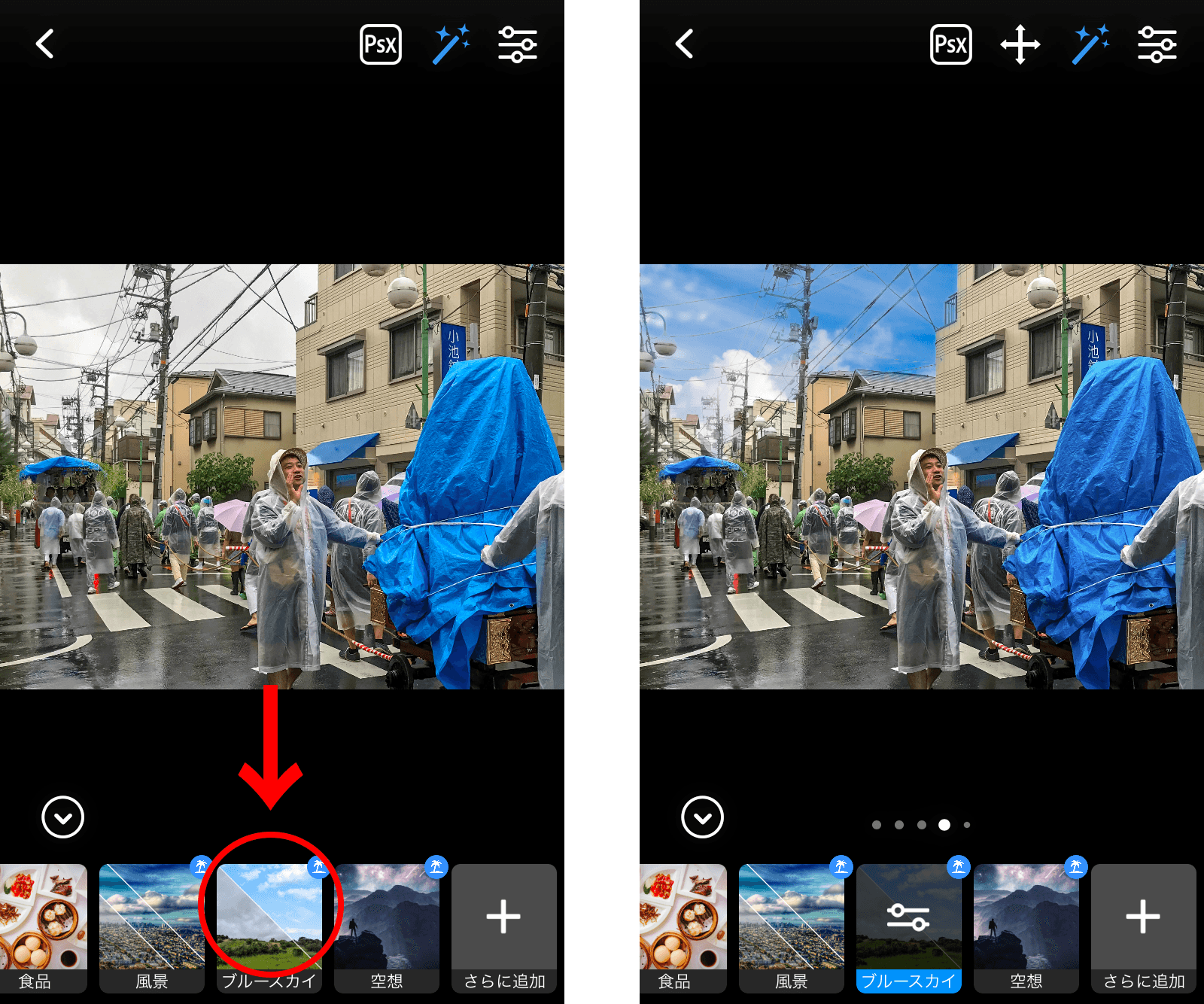 「Photoshop Camera」は,カメラアプリという位置づけですが,カメラロールに保存されている写真も呼び出すこともできます。たとえば,雨天の日に撮影した写真を読み込んで,レンズを「ブルースカイ」に設定すると…