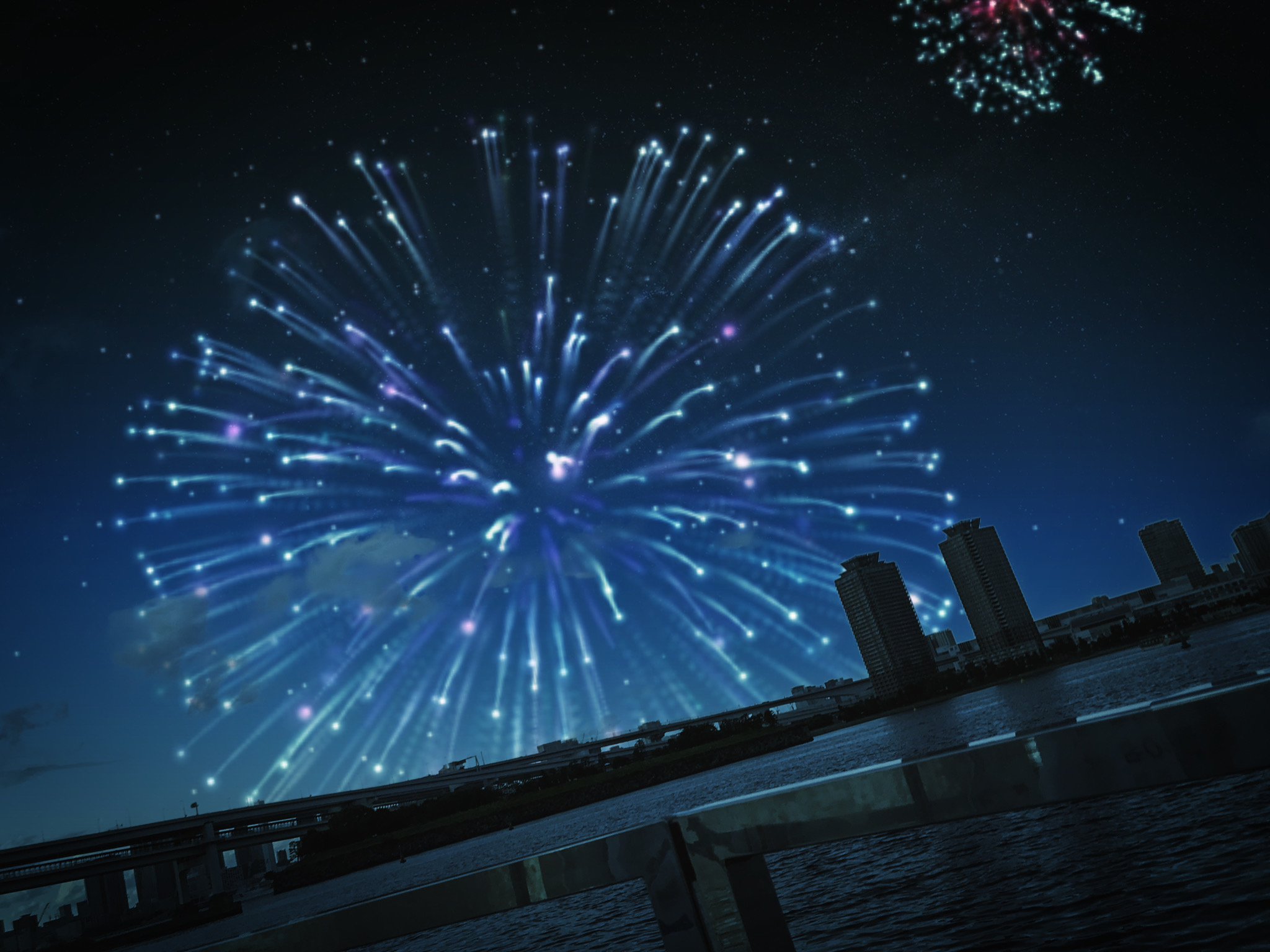 東京湾。動画として保存すると,花火に連動して建物や水面の明るさも変化します。