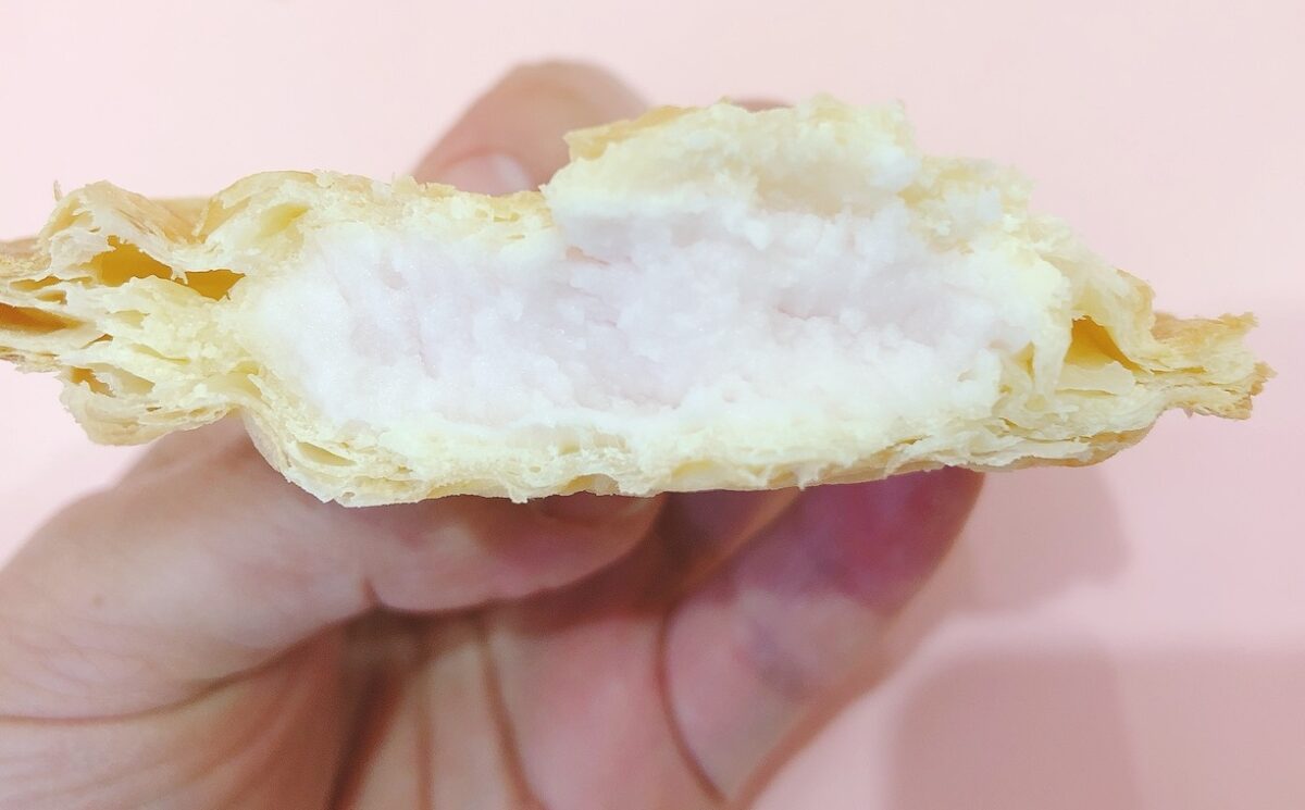 そしてなんといってもこの桜の花のような優しい色のストロベリークリームがおいしいです。つぶつぶ感はなくとも、ほんのり効いた酸味と本物の果実のような香り、ぷよっとした口当たりが甘いクロワッサン生地との相性抜群!