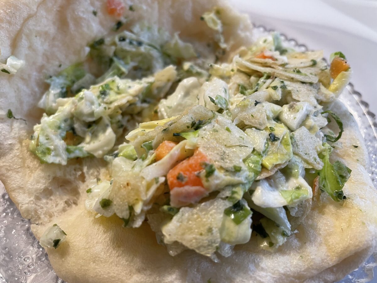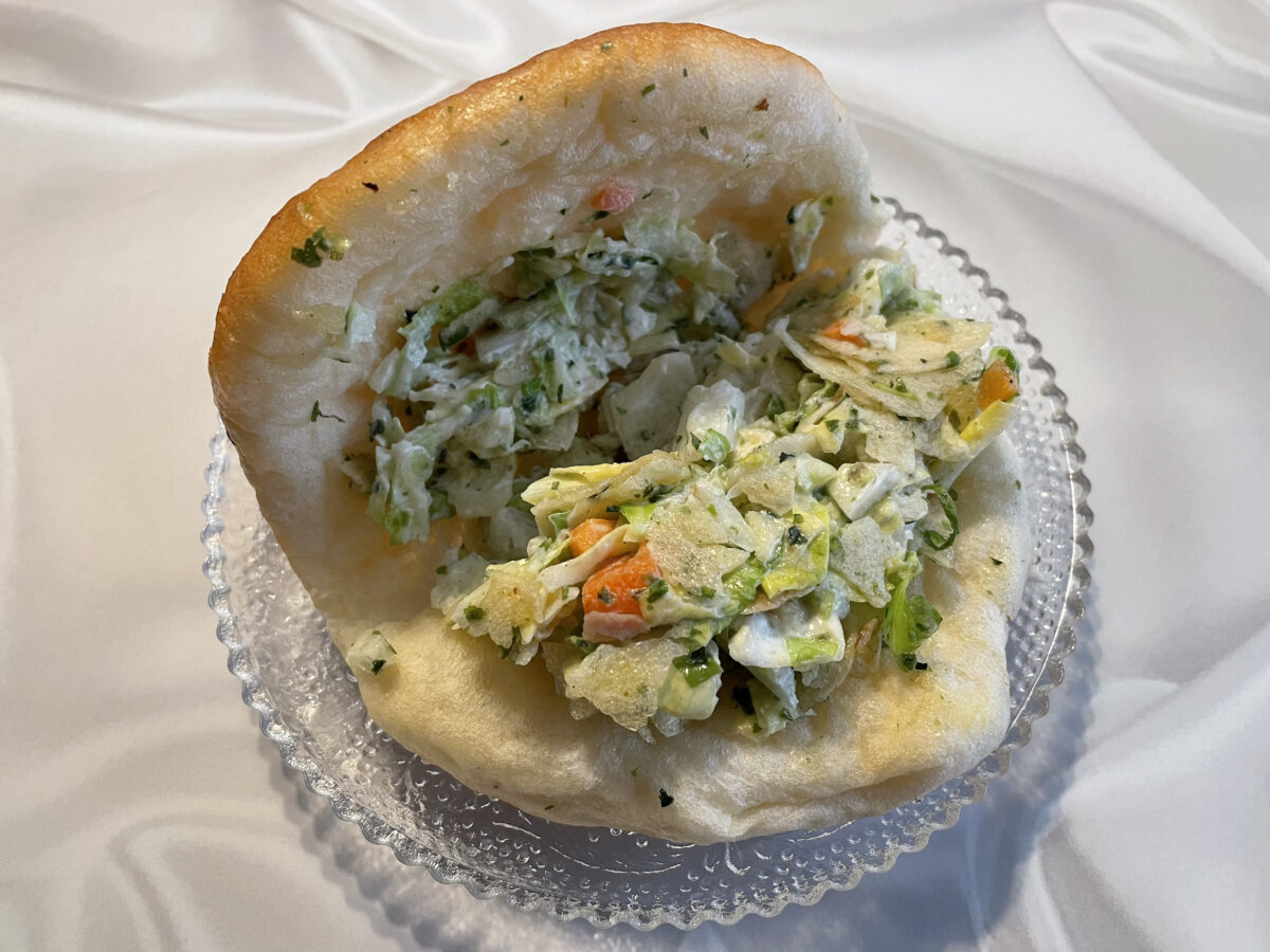 中を開けると思った以上にポテトチップスが入っている事がわかります。キャベツやにんじんのシャキシャキ感に、水分を含んだポテトチップス。しかし、思ったよりシナシナではなく、ほどよくパリ感も残っています。後味にからしの風味と青海苔の香りもプラスされ、マヨネーズやバターなどのオイリー感が、癖になってしまう。そんなパンです!初めて食べても懐かしい、そしてまたリピートしたくなる「ポテチパン」ぜひ、横須賀で召し上がってみてくださいね!
