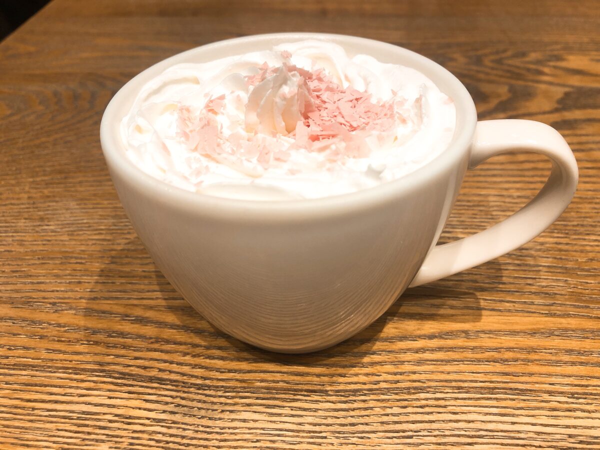 こちらはテイクアウトカップに入ったホットの「さくらベリーラテ」。テイクアウトのドリンクにもたっぷりのホイップクリームとさくらチョコレートがたまらないですね。購入された方も、春の気分を先取りできたとおっしゃっています。