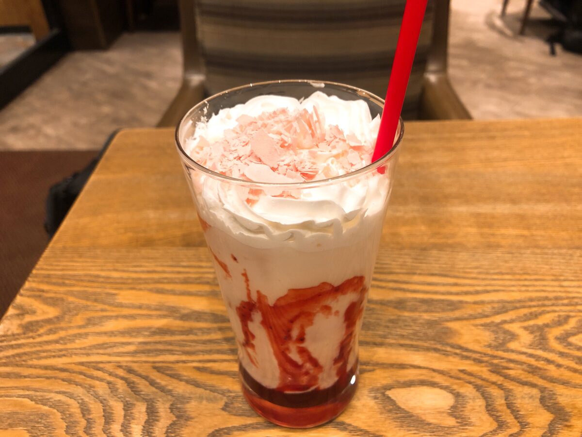 「桜」といわれてイメージする桜の葉の塩味はなく、ミルクとクリームとの相乗効果で、和菓子が好みでない人も楽しめるスイーツのようなドリンクになっています。ソースにはジャムのように苺の果肉が入っているので、つぶつぶとした食感も感じられて美味しいです。