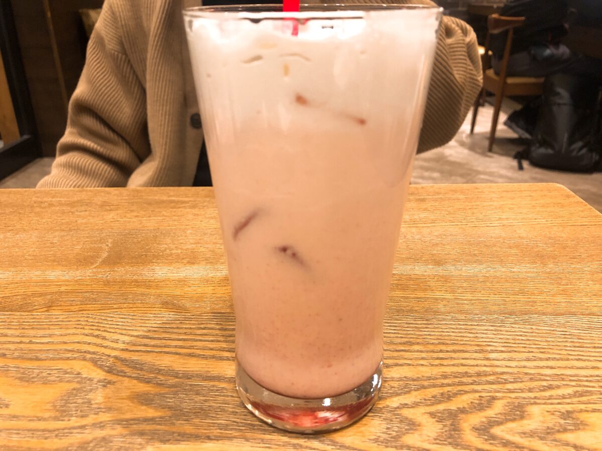 続いてアイス。透明のグラスに入っていると、ベリーソースのマーブル模様がわかるのでかわいさがアップしている気がします。飲んでみると、ドリンクの内容の構成はホットと同じ。氷が入ってるぶん、混ぜて飲むとホットよりもキレがよく、ミルクがすっきりと感じられました。さくら好きの人にはもちろん、苺が好きな人にも自信をもってオススメできます!