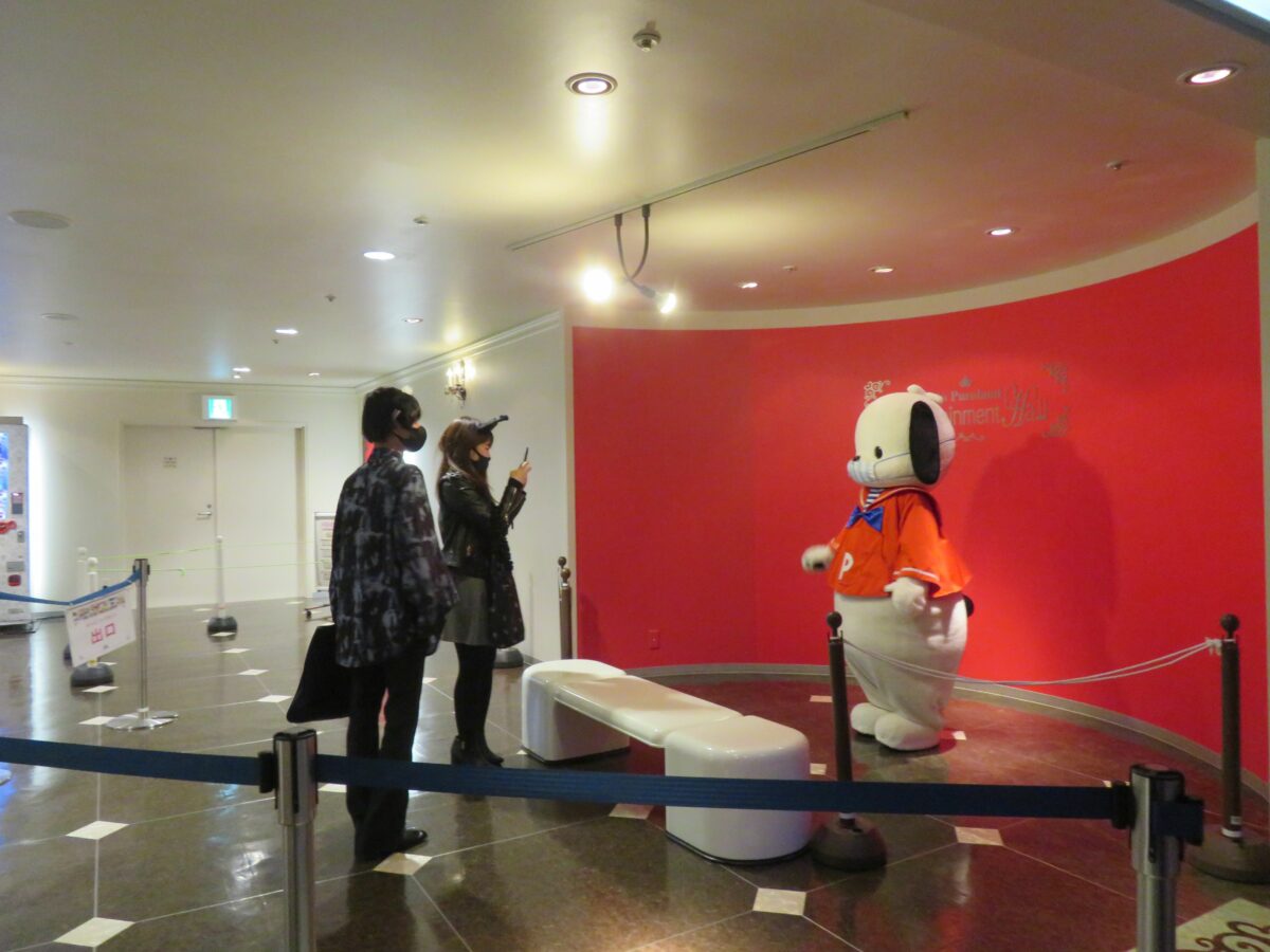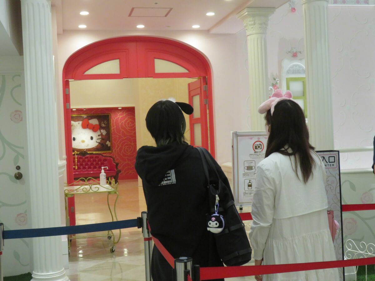 玄関のゲートを潜ると、解放感が満ち溢れるレインボーホールに入ります。正面ではキティちゃんが微笑んでいます。