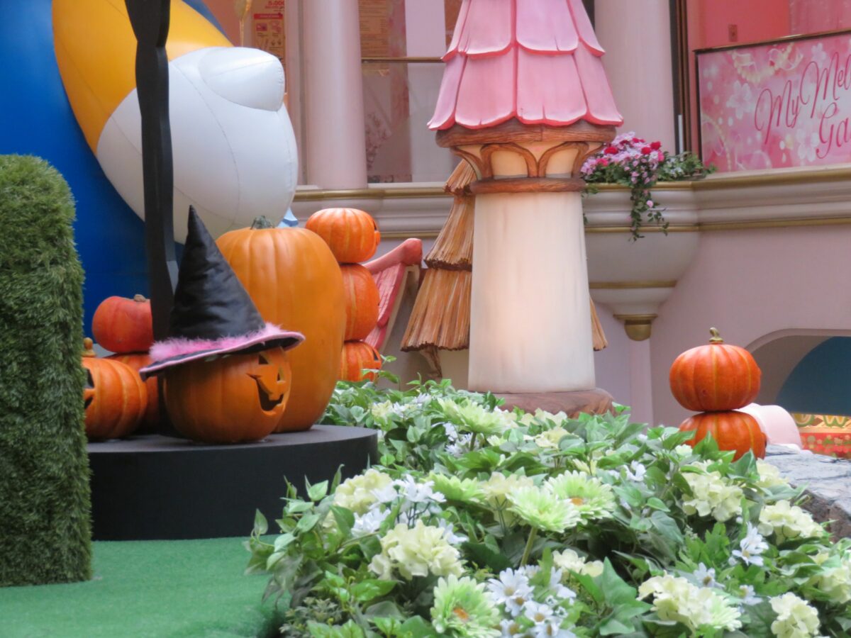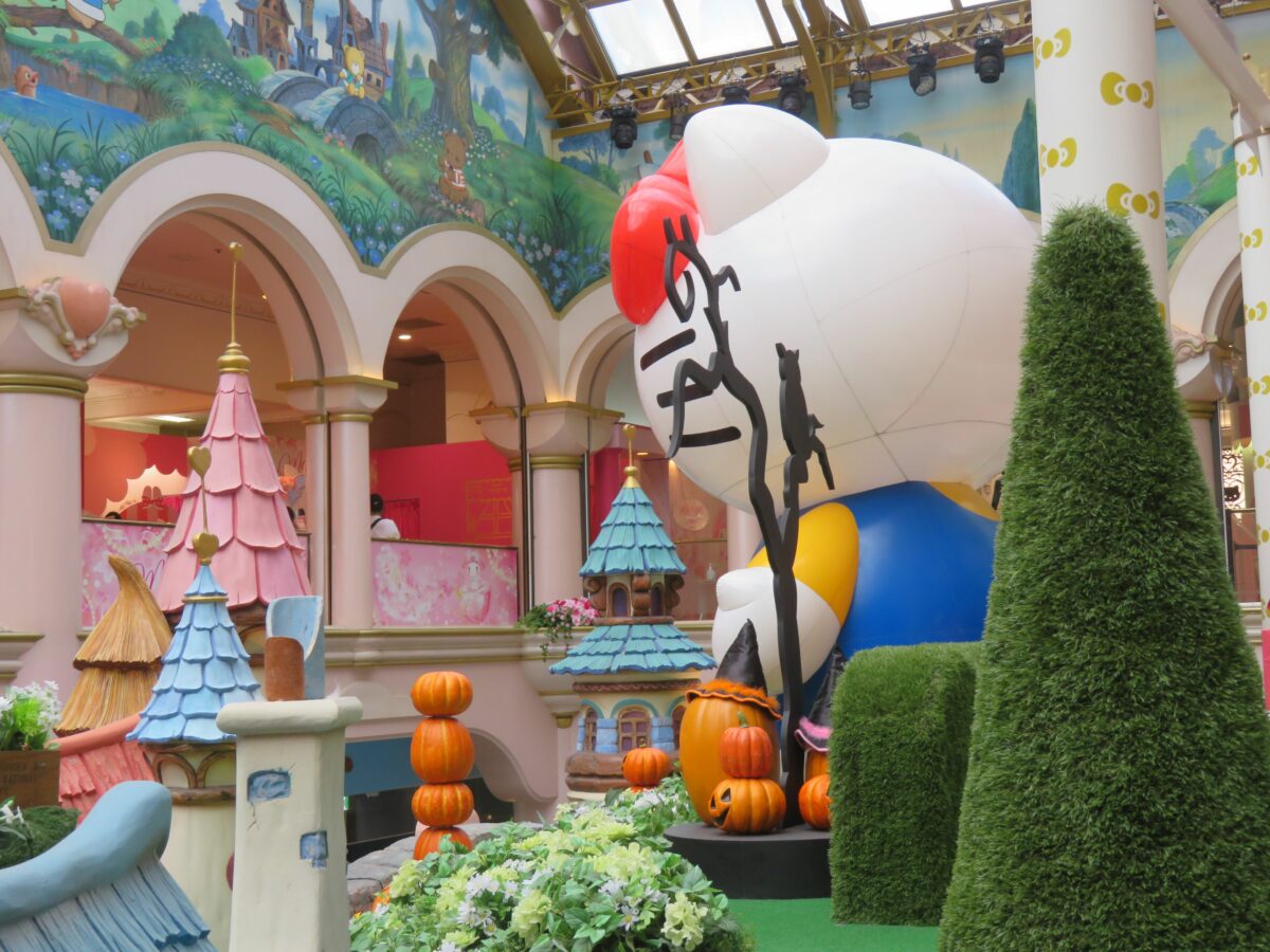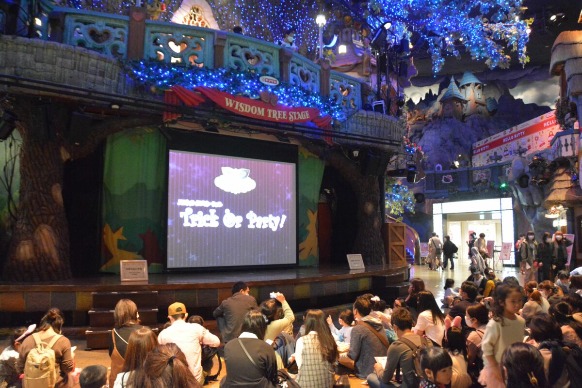 レインボーホールの中央でハロウィンの装飾で囲まれるキティちゃん