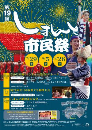 四万十市の夏の恒例行事として親しまれているこのお祭り(2023年は7/29・8/5・8/26に開催)。「市民祭」の名の通り、市民が主役のお祭りとなります。市民有志が実行委員となり作り上げております。