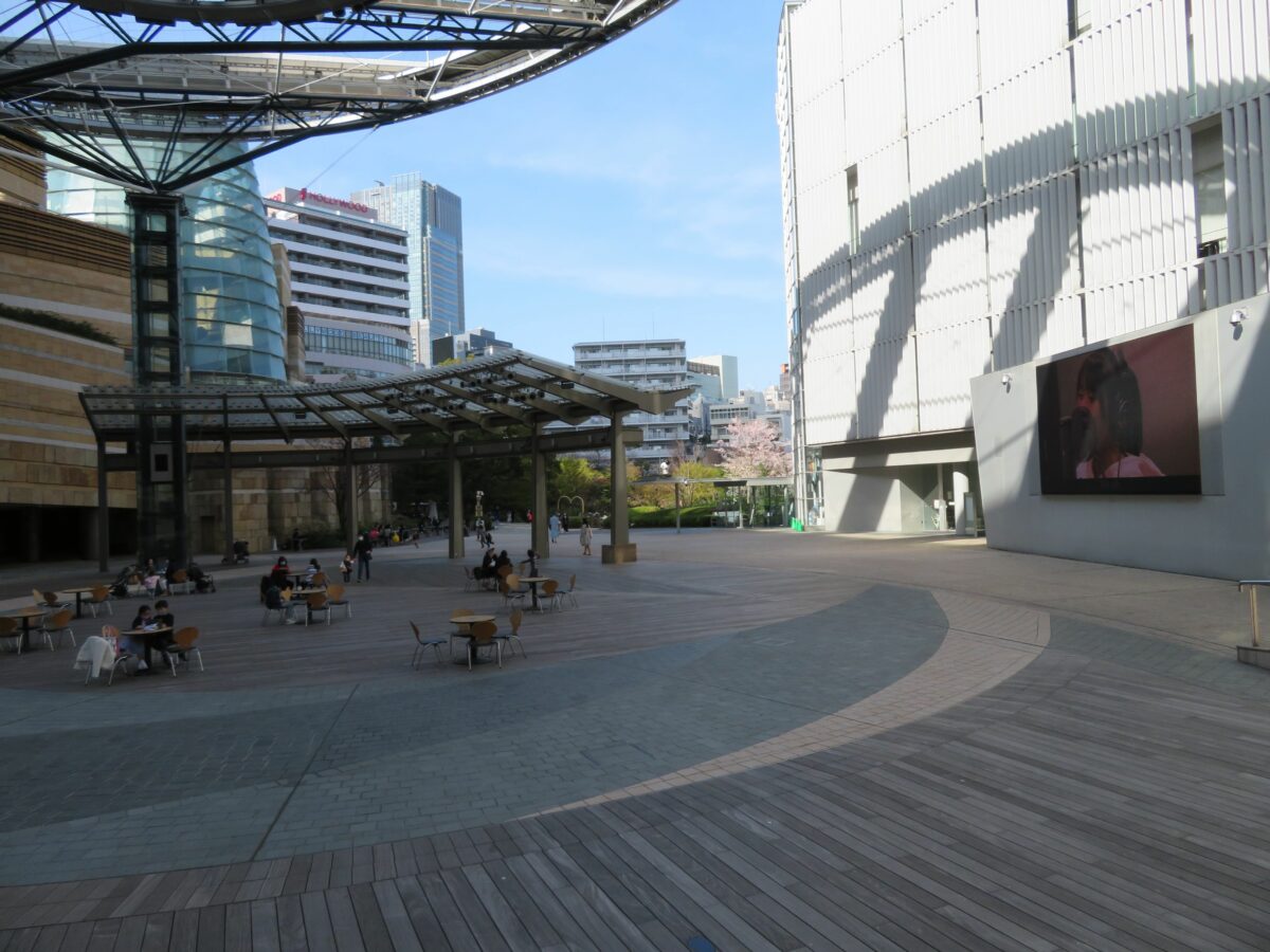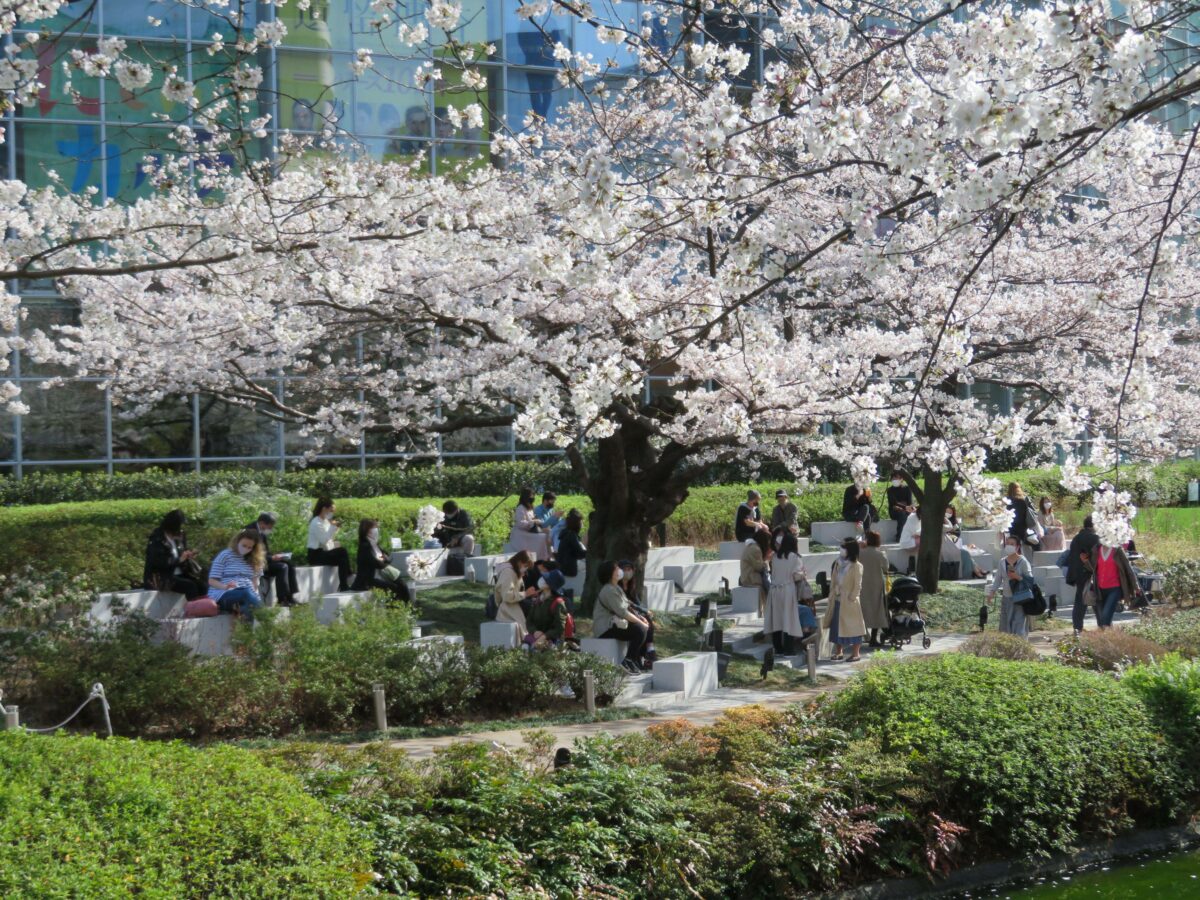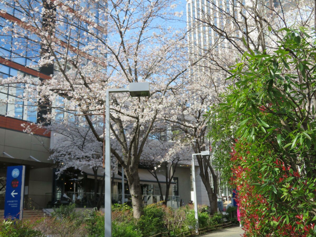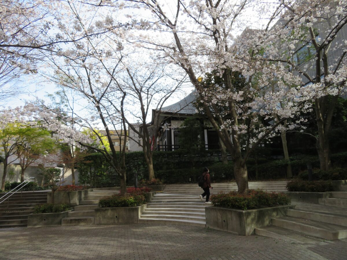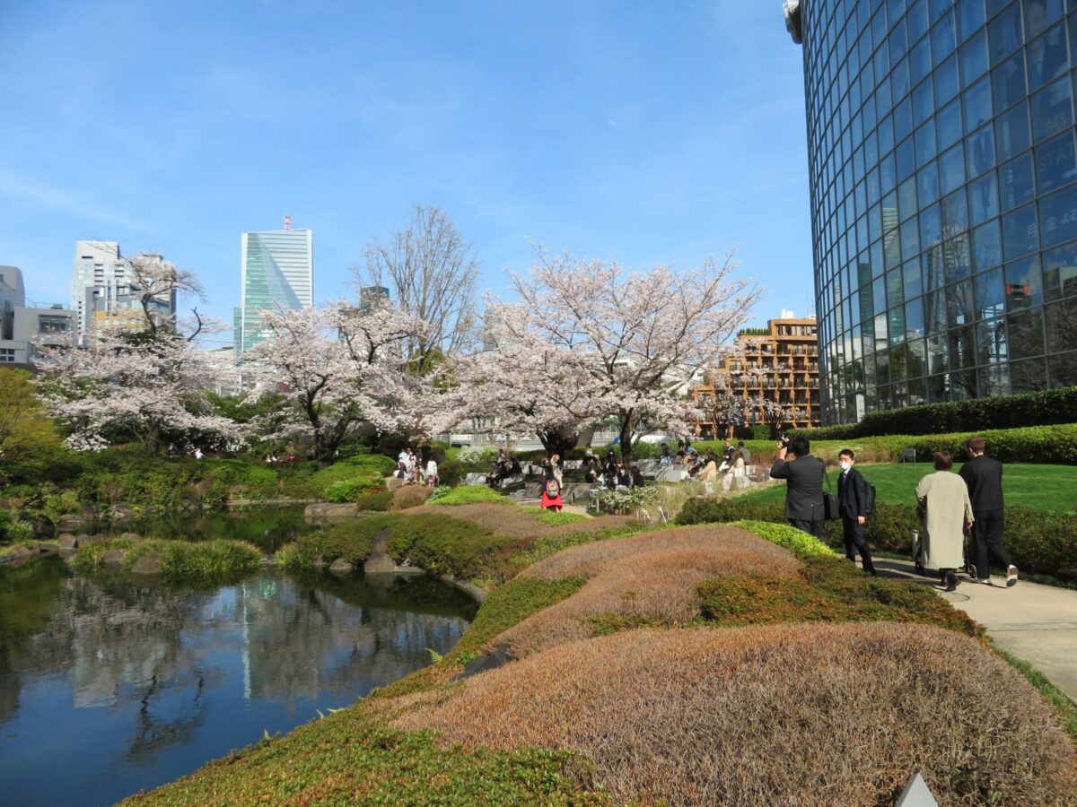 六本木さくら坂の東端にはテレビ朝日本社ビルが接しています。ガラス張りの建築を桜が取り囲んでいます。また建物の北には毛利庭園が整備されており、さくら坂とは異なる雰囲気で早春の花を楽しむことができます。