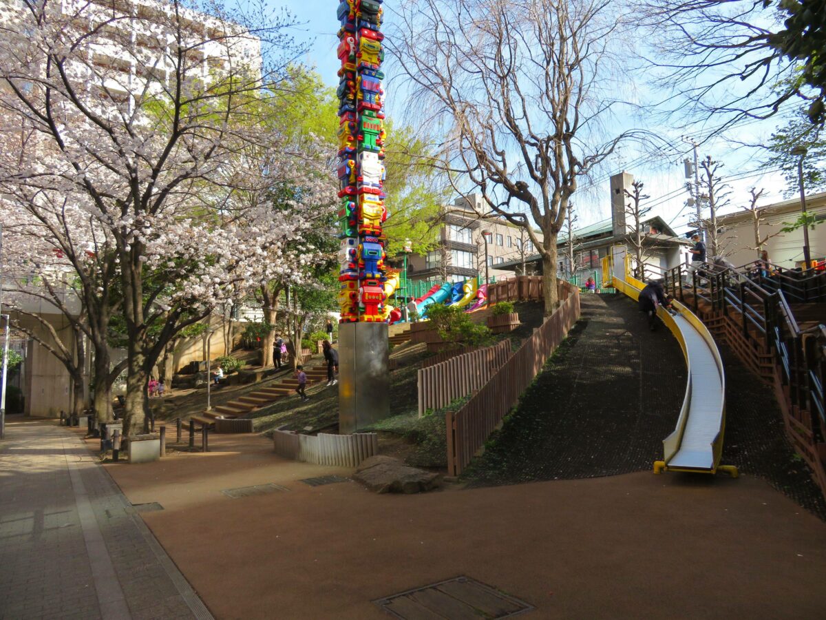 六本木さくら坂沿いには数棟のレジデンスが建ち、立ち寄りスポットとなるのは、妙経寺とさくら坂公園のみです。さくら坂公園では、韓国を代表するアーティストの一人チェ・ジョンファがデザインしたトーテムポールのようなパブリックアートのロボロボロボや滑り台、スプリング遊具、ローラーコースターがユニークな姿を見せています。