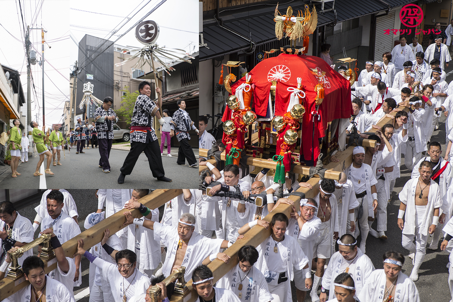 京都らしい剣鉾が美しい音色で魔を祓い、火消しの纏、龍舞の行列のあと御神輿が練り歩きます。