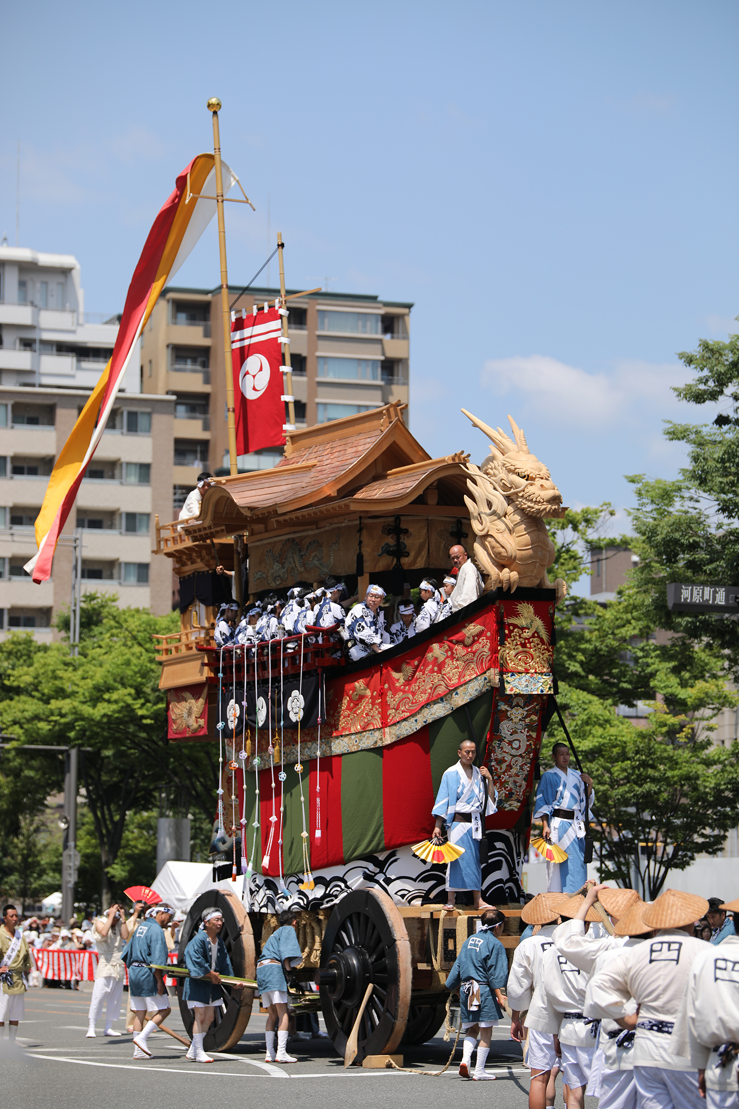 京都らしい剣鉾が美しい音色で魔を祓い、火消しの纏、龍舞の行列のあと御神輿が練り歩きます。