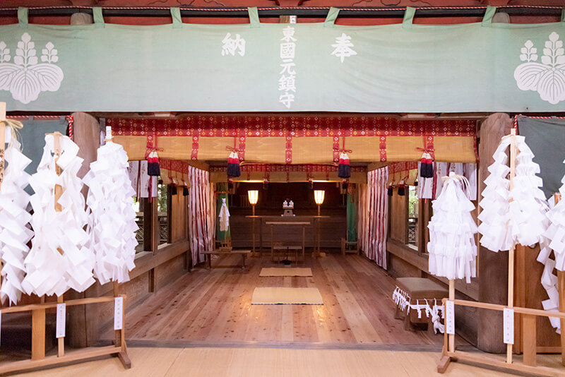 本殿内には各流派が奉納した御幣(ごへい:紙垂を竹または木の幣串に挟んだもの)がずらりと並べられており、早朝の神社らしい清々しい雰囲気が一帯に漂います。