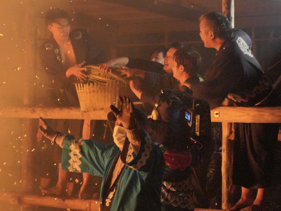 会場に組まれた小屋まで攻め入ってきた攻め手を迎え撃つ受け手。肩にひょいと燃え盛る炎を担いで、まさか、この構えは?