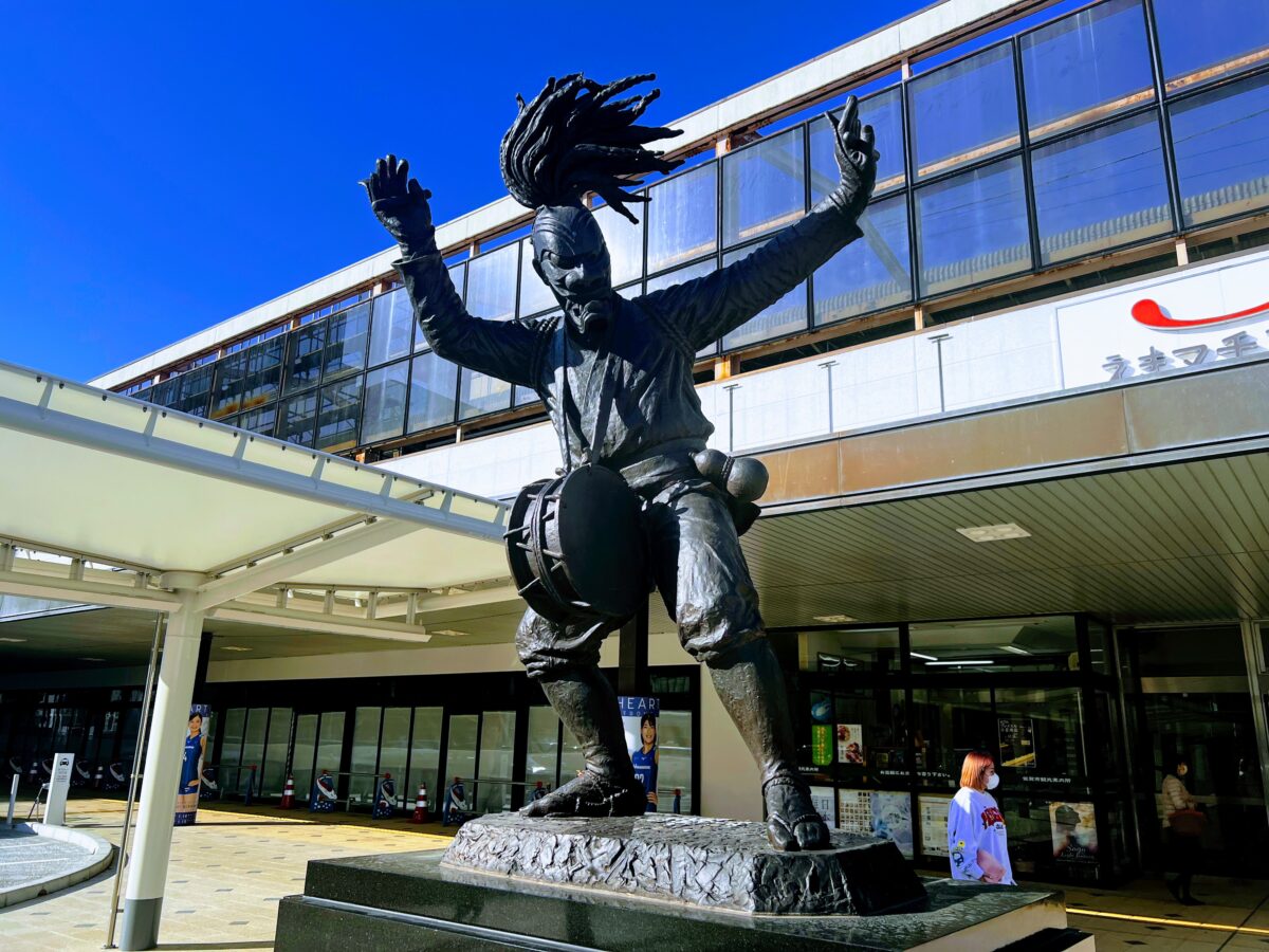 東京から福岡空港を経由し、電車でいざ佐賀は伊万里市へ。オマツリは夜からなのでいったん佐賀駅で途中下車。佐賀駅前には、平安時代の風流踊りを源流とする佐賀の伝統芸能・浮立(ふりゅう)のかぶいた像が!(いずれこの奇妙な踊りも取り上げたい)。