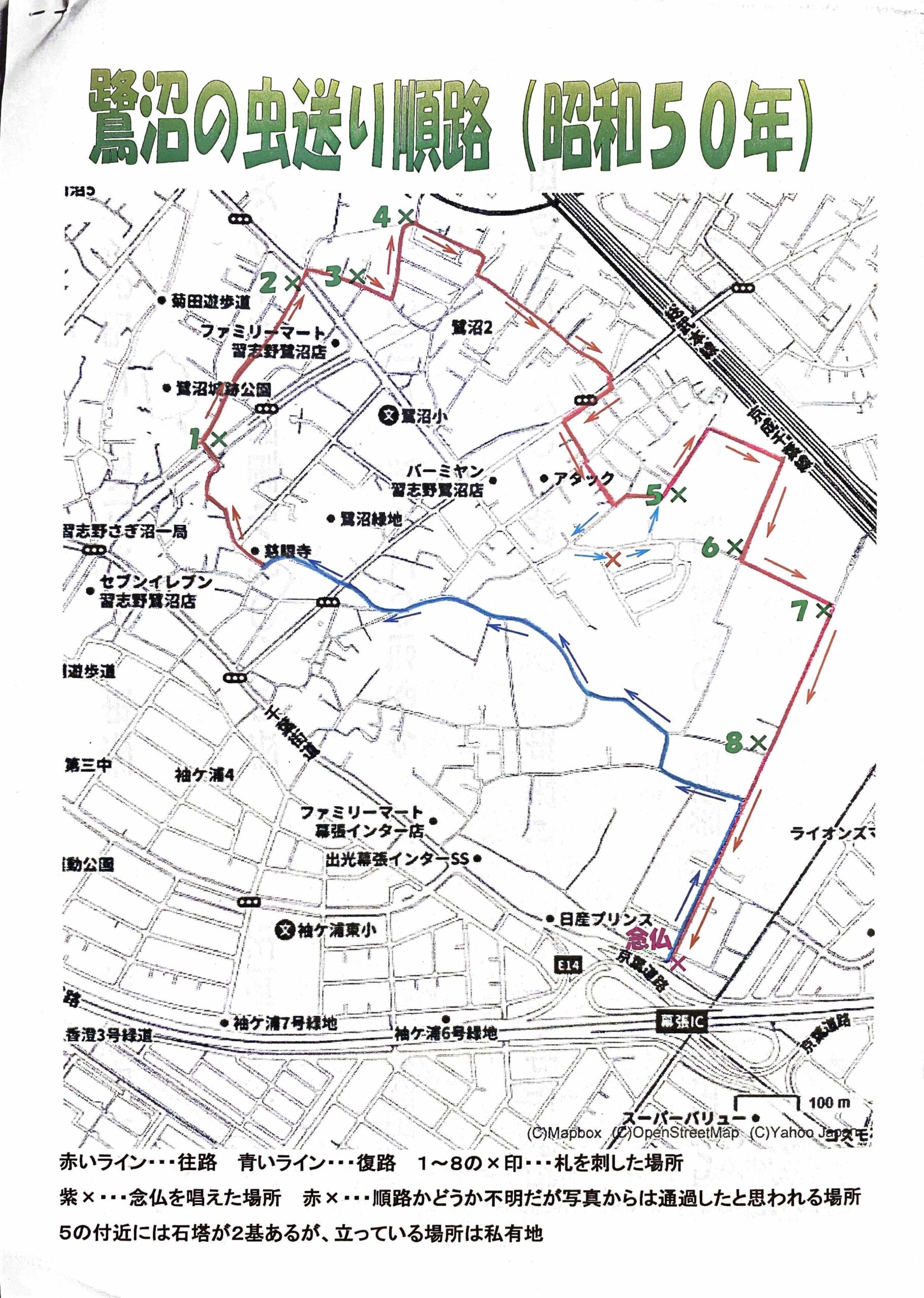慈眼寺というお寺を起点として、鷺沼の集落を時計回りに休憩を挟みながら一周する4kmほどのルートです。辻々には「害蟲駆除祈祷之護符」と書かれたお札を刺し、途中村の境界にあたる場所、現在幕張インターとなっている所ではお経を読み上げています。