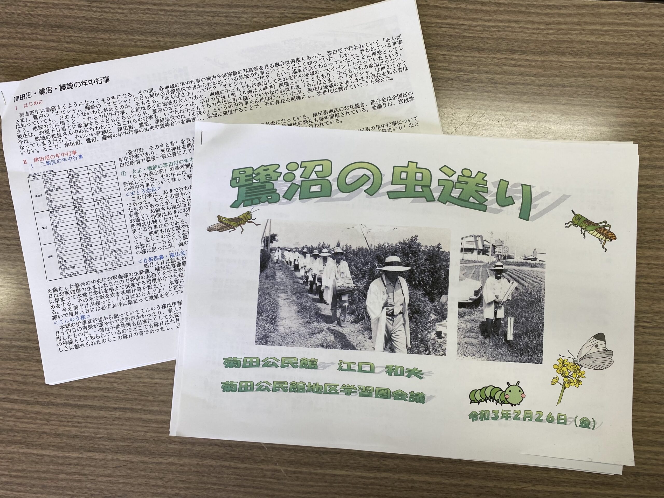 というわけで、江口さんが勤めている菊田公民館(習志野市津田沼7-9-20)にお邪魔して、鷺沼の虫送りについて詳しいお話を聞かせてもらうことになりました。