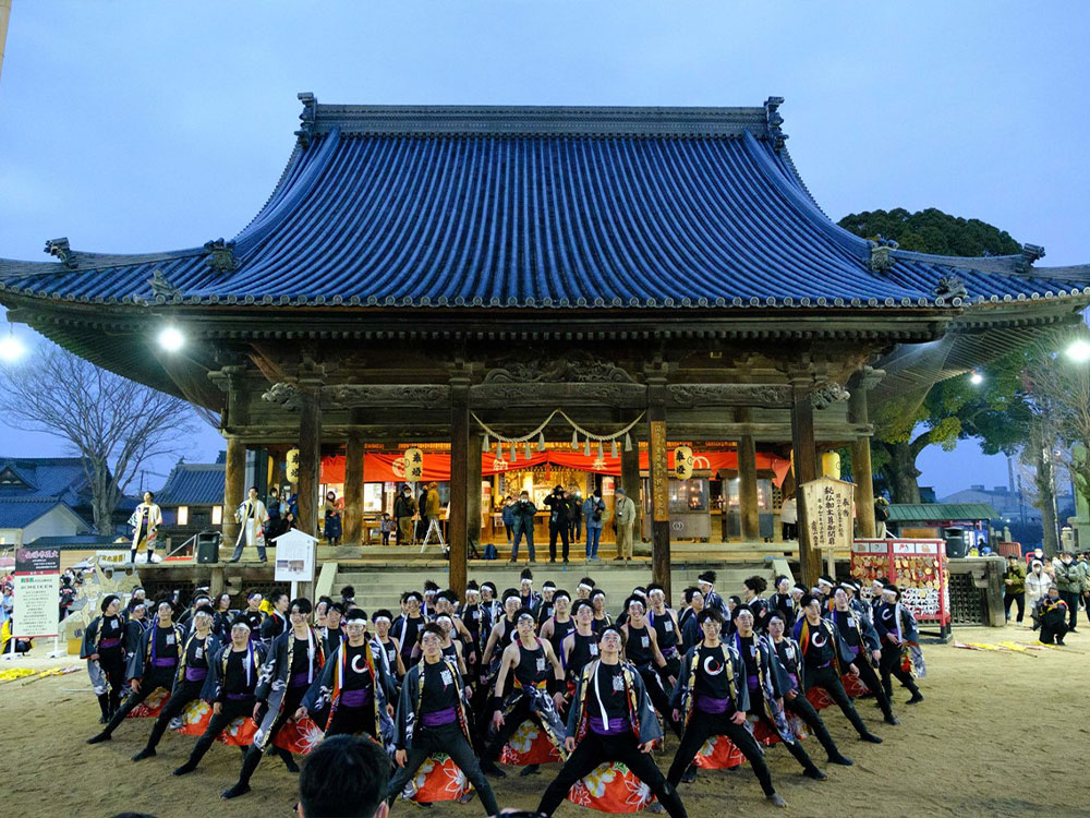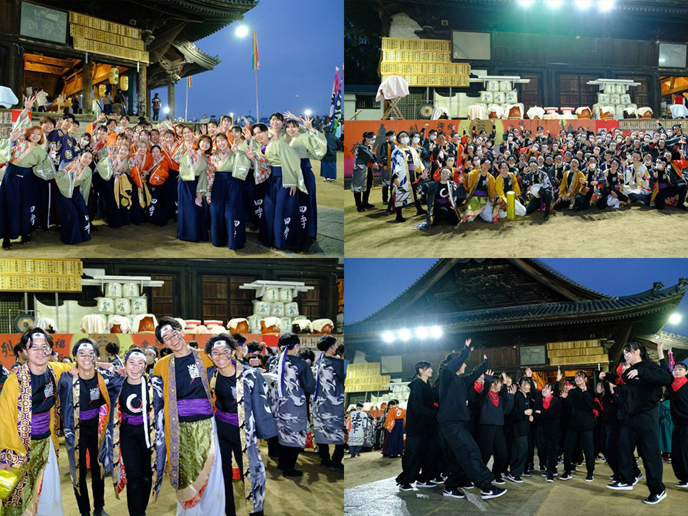 会陽を盛り上げるために、市内の高校や大学、有志たちによるチームがそれぞれ若さ溢れる演舞を披露。裸衆が現れる前から境内には大勢の観客が押し寄せ、大いに盛り上がっています。