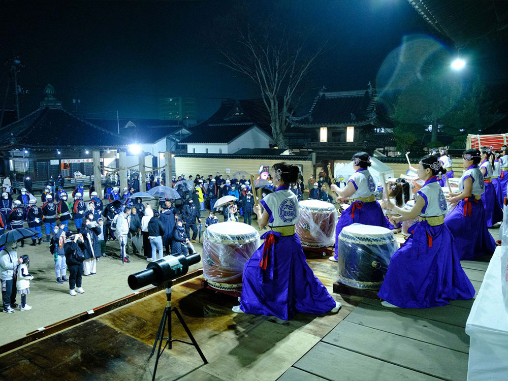 「はだか祭り」というと女人禁制と思われがちですが実はそうではありません。裸の男衆に負けじと、いや男衆たちに力を与えるかのように女性による会陽太鼓の勇壮な音色が、境内に響きわたります。