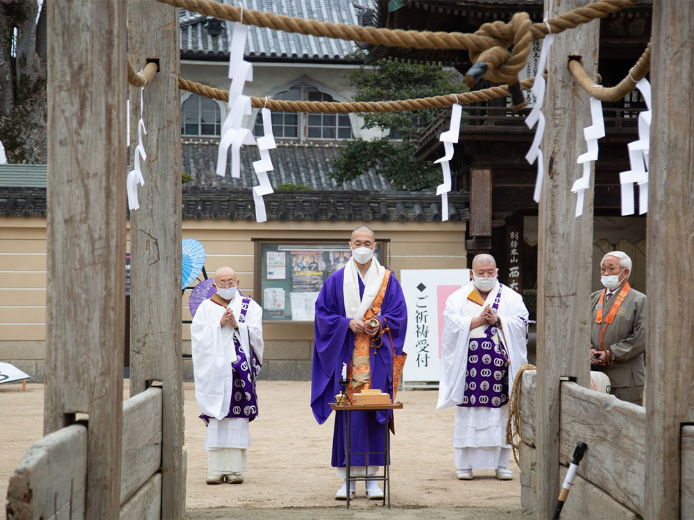歴史の重みを感じる仁王門をくぐると、会陽期間中に建てられている四本柱(しほんばしら)でちょうどご住職による祈祷が行われていました。