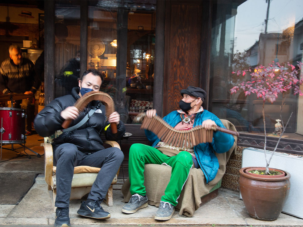 手招きされるので同行した取材スタッフのひとりが横に座ると、ありがたいご指導をいただきました。楽しそうに鳴らさないといけないそうですが、やりすぎると「ふざけちゃいけん」と叱られるのでその塩梅がなかなか難しいようです(笑)