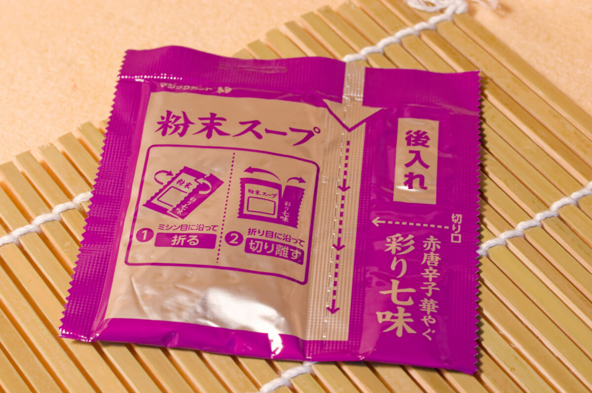 七味唐辛子の量は控え目。ちなみに、筆者は七味唐辛子のことを「なないろ」と呼んでいましたが、妻には通じませんでした。七味唐辛子のことを「なないろ」と呼んでいる読者の方いらっしゃいますか?