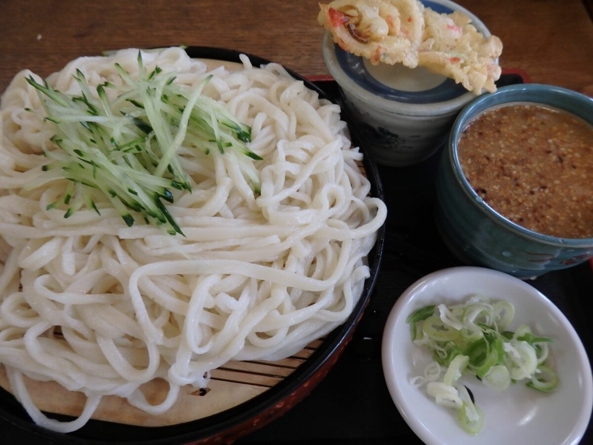 加須市の市内には40を超えるうどん店が点在し、手打うどんの味を競っています。加須の手打うどんで最もシンプルなメニューは、冷たいうどんに、あっさり味のつゆを組み合わせた「冷汁うどん」でしょう。このつゆにゴマ味噌の風味を添えれば、「ゴマ汁うどん」となります。