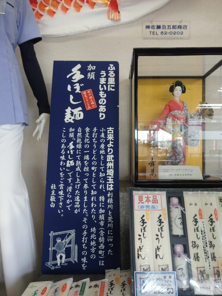 加須駅の売店に掲示される加須うどんの手ほし麺の解説パネル