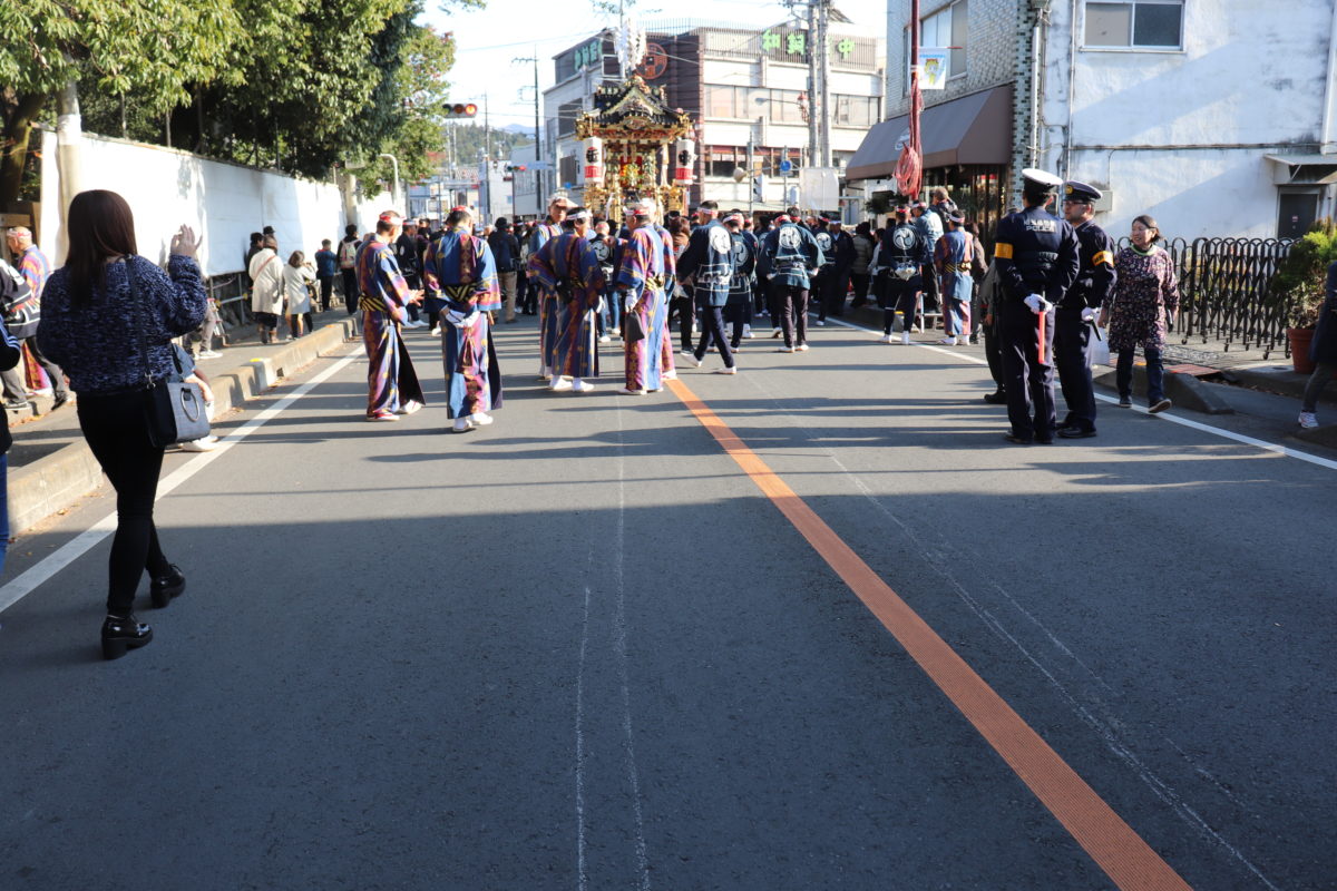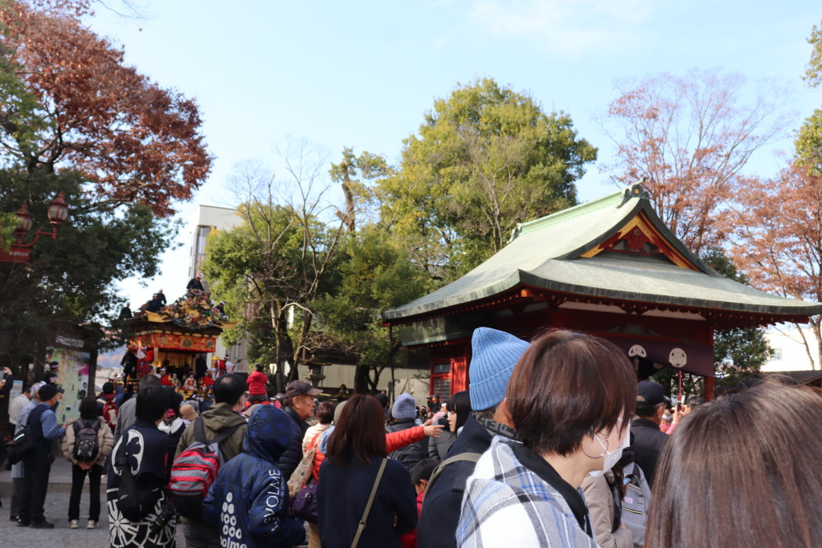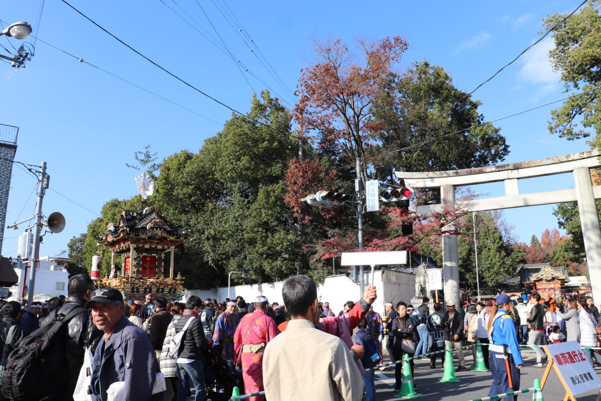 宮参りを行うため、境内には次々と屋台が入ってきます。 屋台が現れるたびに、囃子手や引き手の掛け声と太鼓の音が境内に鳴り響き、祭りは早くも盛り上がりを見せます。