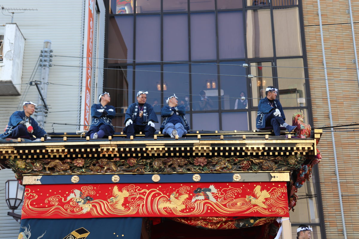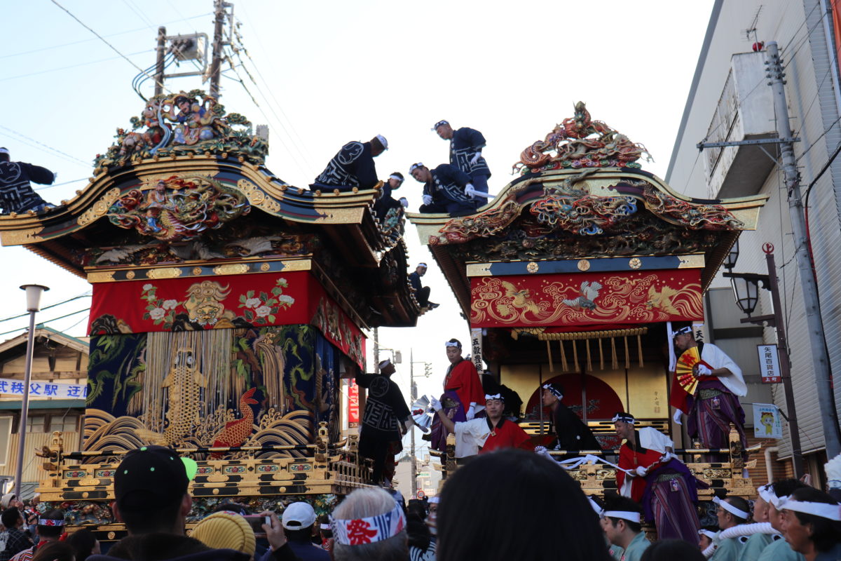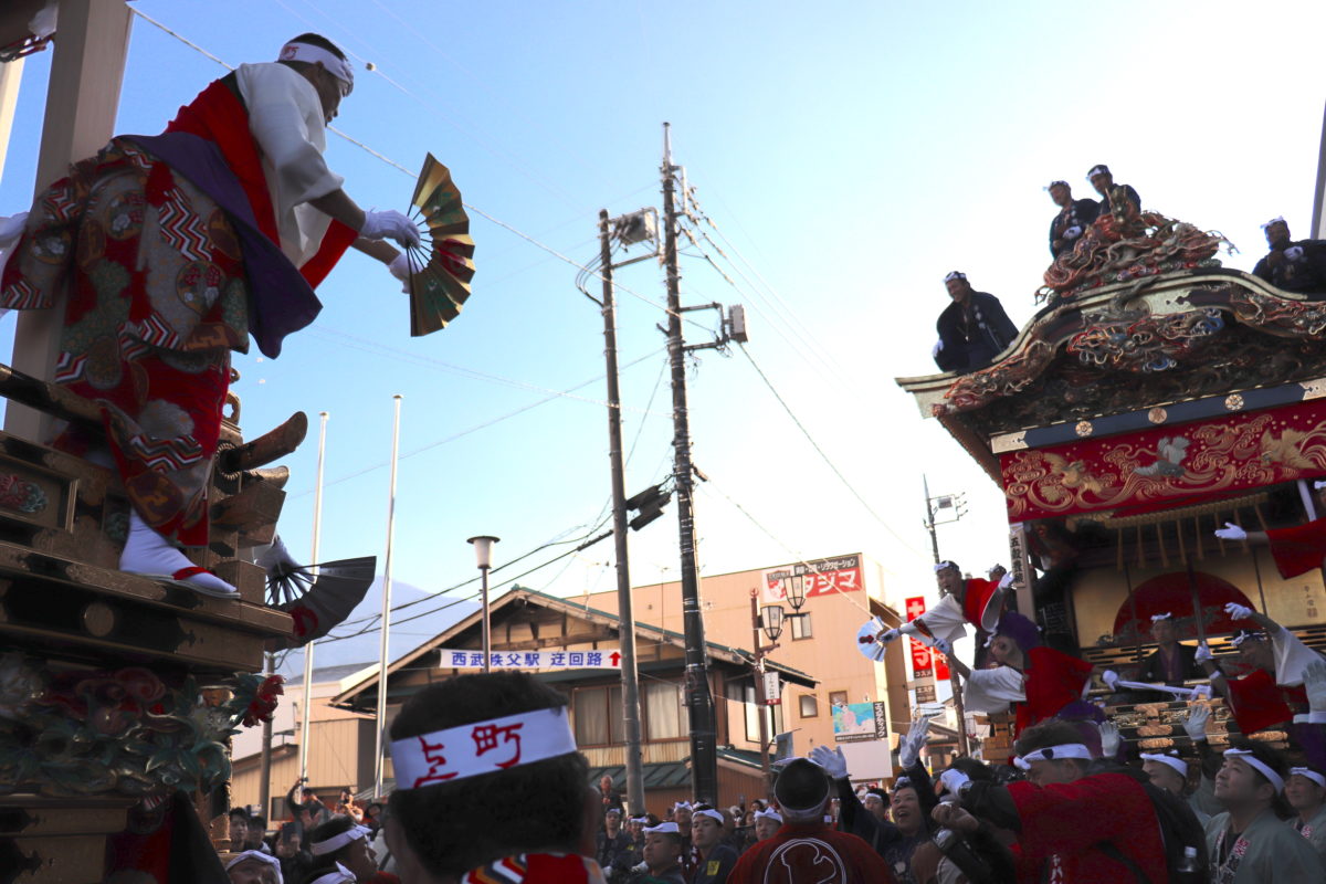 屋台同士が近づくにつれ、屋台に乗る囃子手たちの掛け声の応酬となり、会場は大いに盛り上がります。