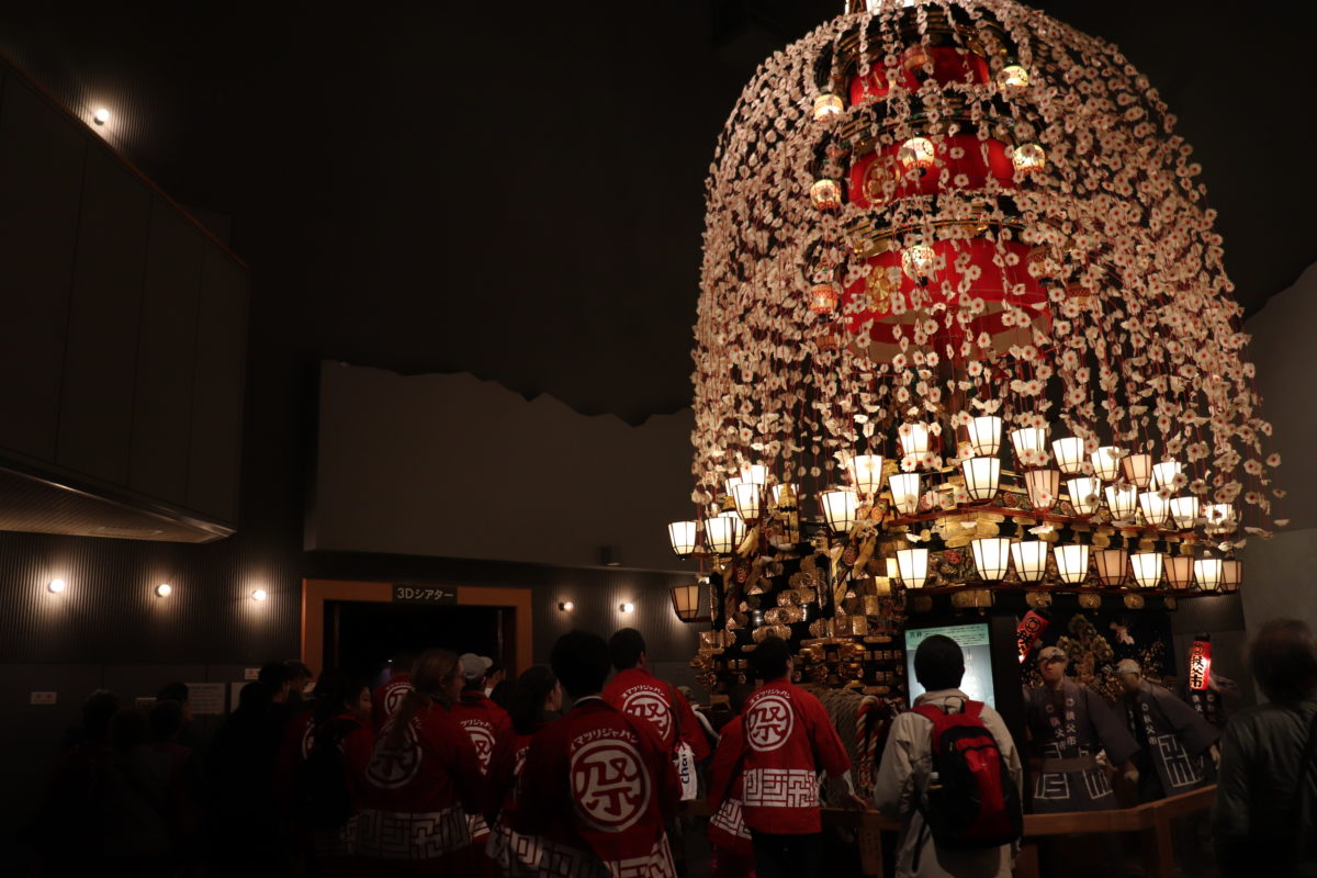 まずは傘鉾・屋台コーナーへ。 2基の傘鉾・屋台が展示されています。こちらでは、プロジェクションマッピングにより、臨場感あふれる祭の様子をバーチャル体験することができます。
