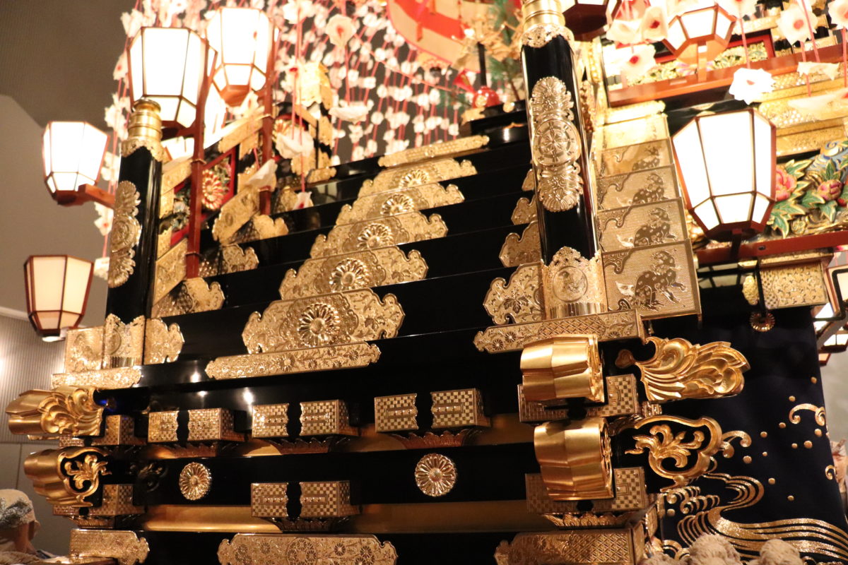 歴史を感じさせる屋台は木の車輪が「ギィィー」と唸りをあげながら町中を曳き回され、重い屋台をてこの原理を応用して方向転換する「ギリ回し」、夜には急勾配の「団子坂」などの見所では集まった観客が大きな歓声を上げます。