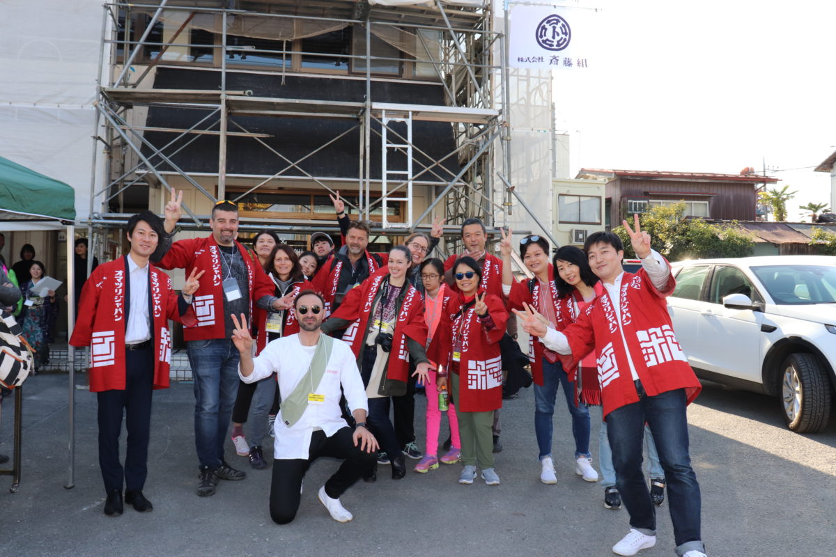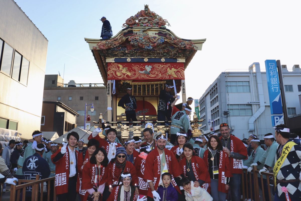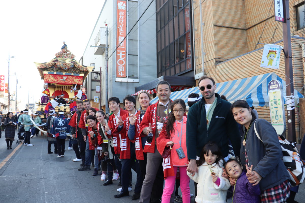 12月2日(日)の12時。屋台を曳くことができる貴重な機会とあって、多くの外国人が集結。記念にスタッフと全員で、はいチーズ!アメリカやノルウェー、台湾など、世界中から集まってくれました。