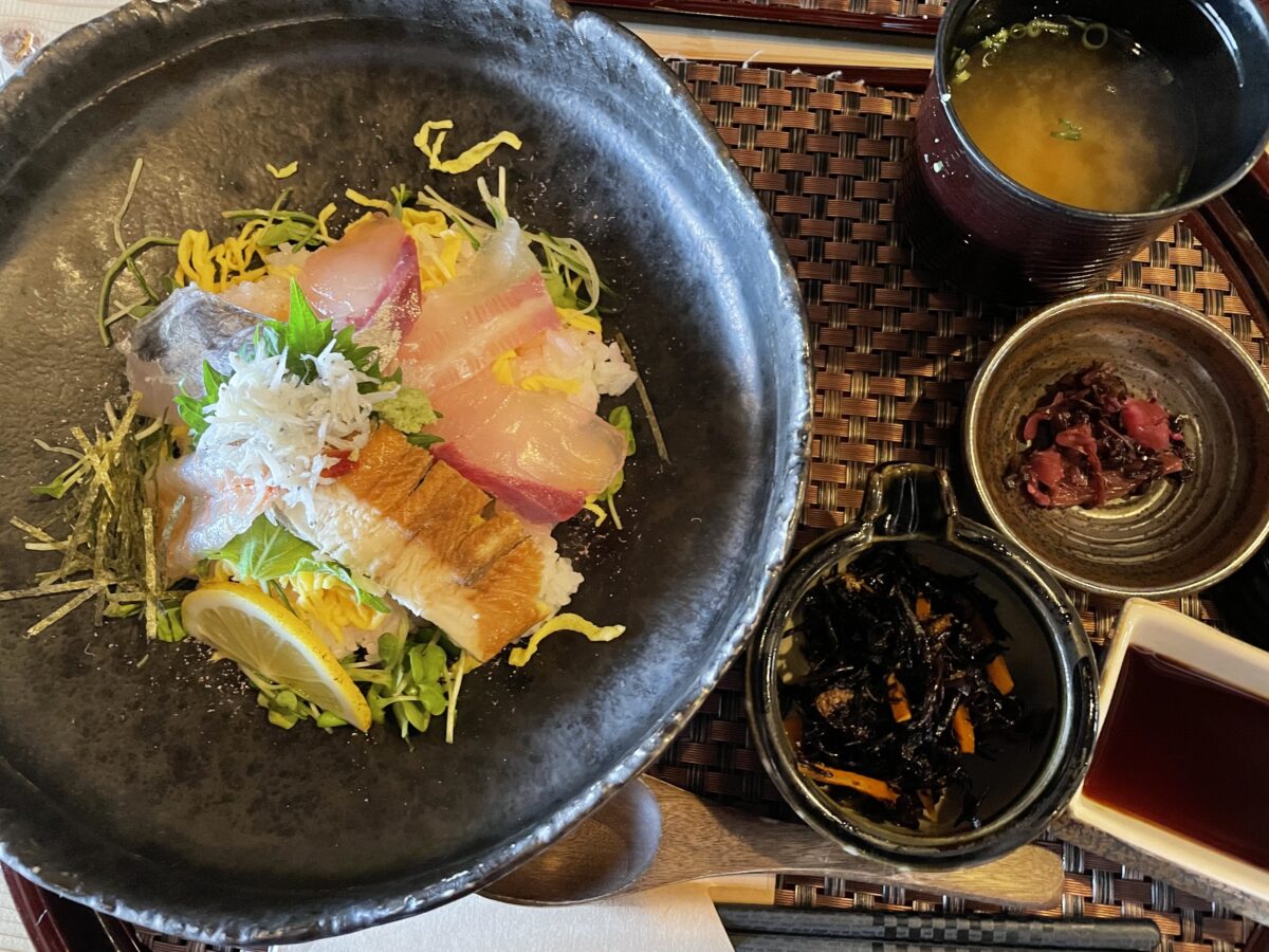 著者は、海鮮ちらし寿司(1,980円税込み)を注文しました。新鮮な地魚やアナゴなどが色とりどりに添えられており、華やかなちらし寿司でした。