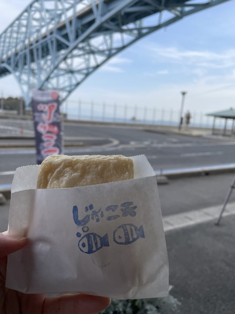 三之瀬地区でオススメグルメは!「海駅三之瀬」で販売されている、じゃこ天(一枚160円税込)。地元の小魚のすり身をタラとまぜあわせ、下蒲刈島の天然海水塩で練り上げたじゃこ天!注文後に揚げてくれるので、揚げたて熱々をいただけます。お土産としてお持ち帰りも出来ますが、やはり揚げたてのじゃこ天は格別!一度は召し上がっていただきたい一品でした!